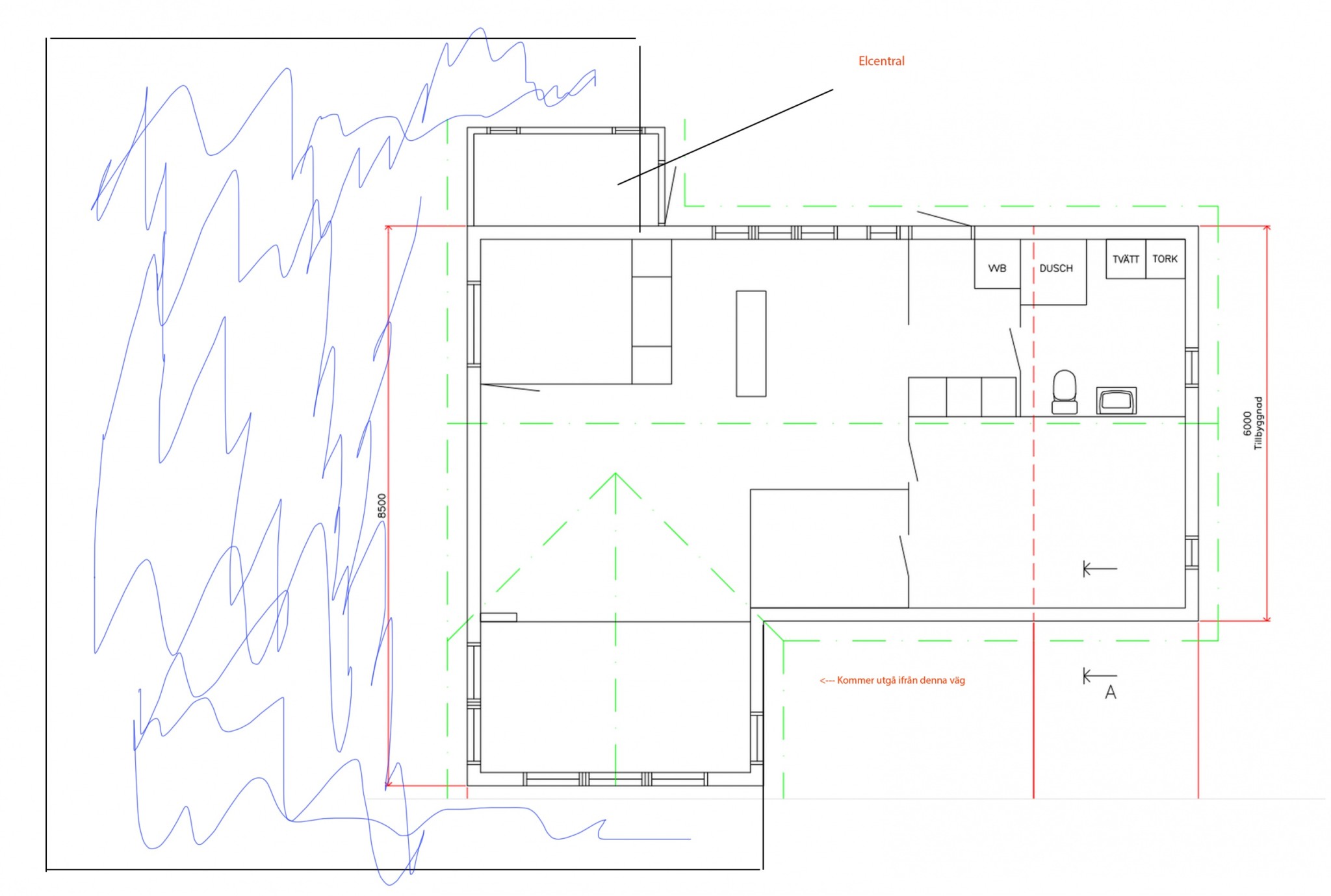 Det vi gjorde senast vi byggde ut var att förlänga huset, nytt badrum/tvättstuga, ny hall, större sovrum, en klädkammare samt att vi satte in nytt kök så vi vill helst slippa röra denna delen nu när vi skall bygga ut igen, visst kan vi tänka oss att flytta någon dörr eller så men inga större ingrepp här.