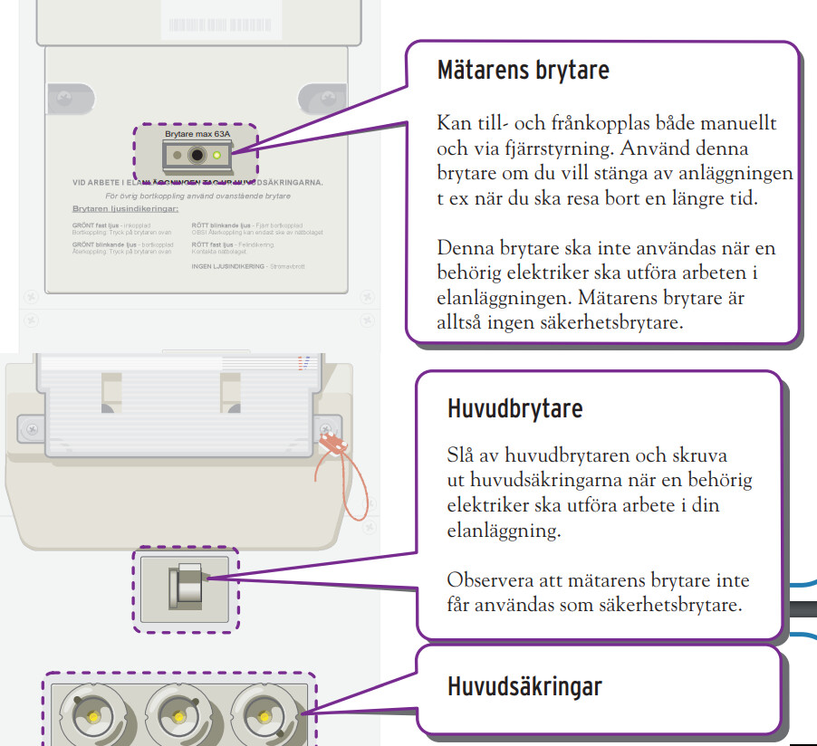 I ett modernt mätarskåp sitter huvudbrytaren efter mätaren.