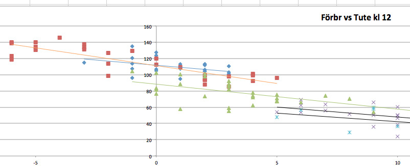 Total elförbrukning (inkl hushåll) som funktion av utomhustemperaturen.