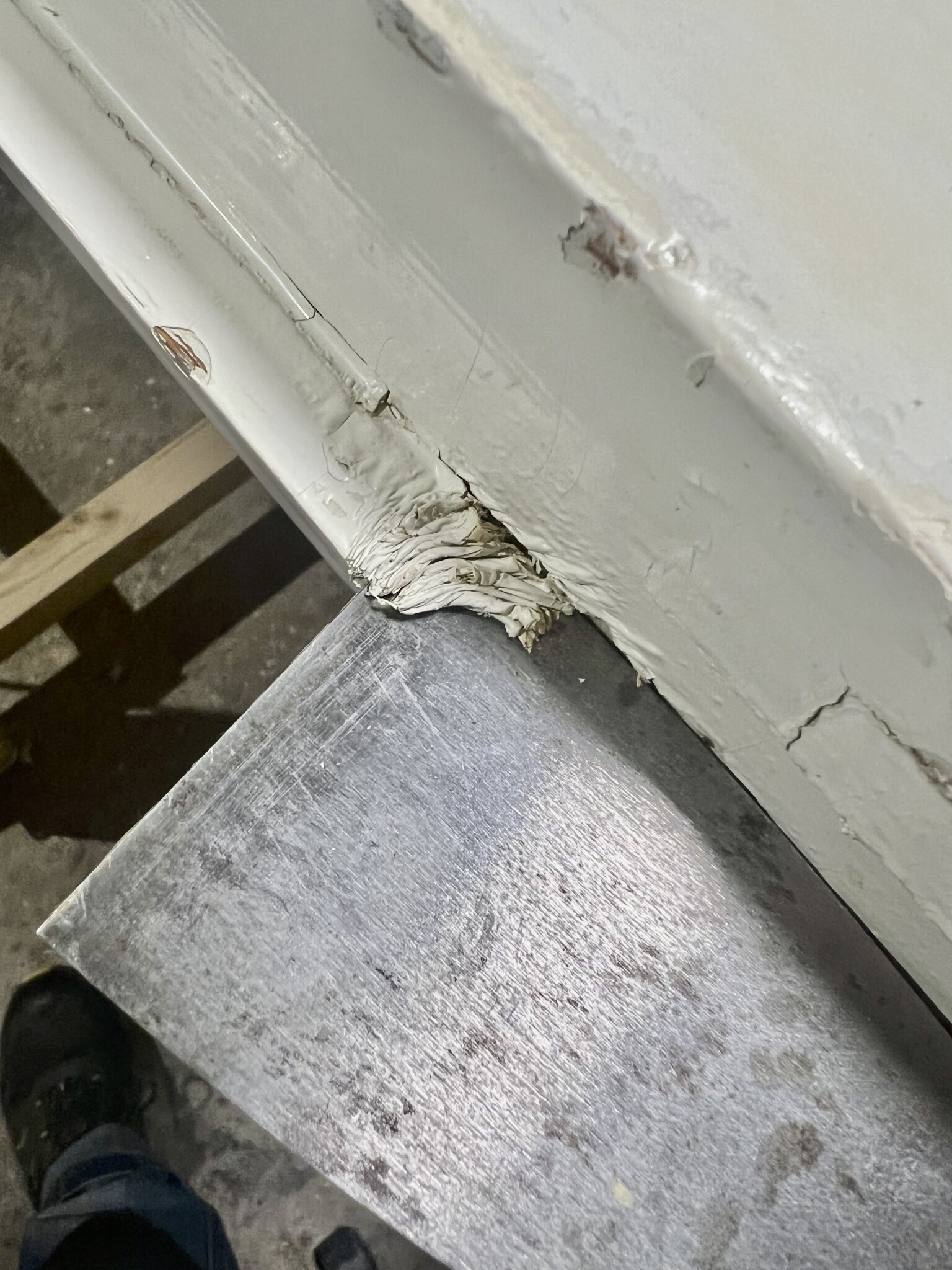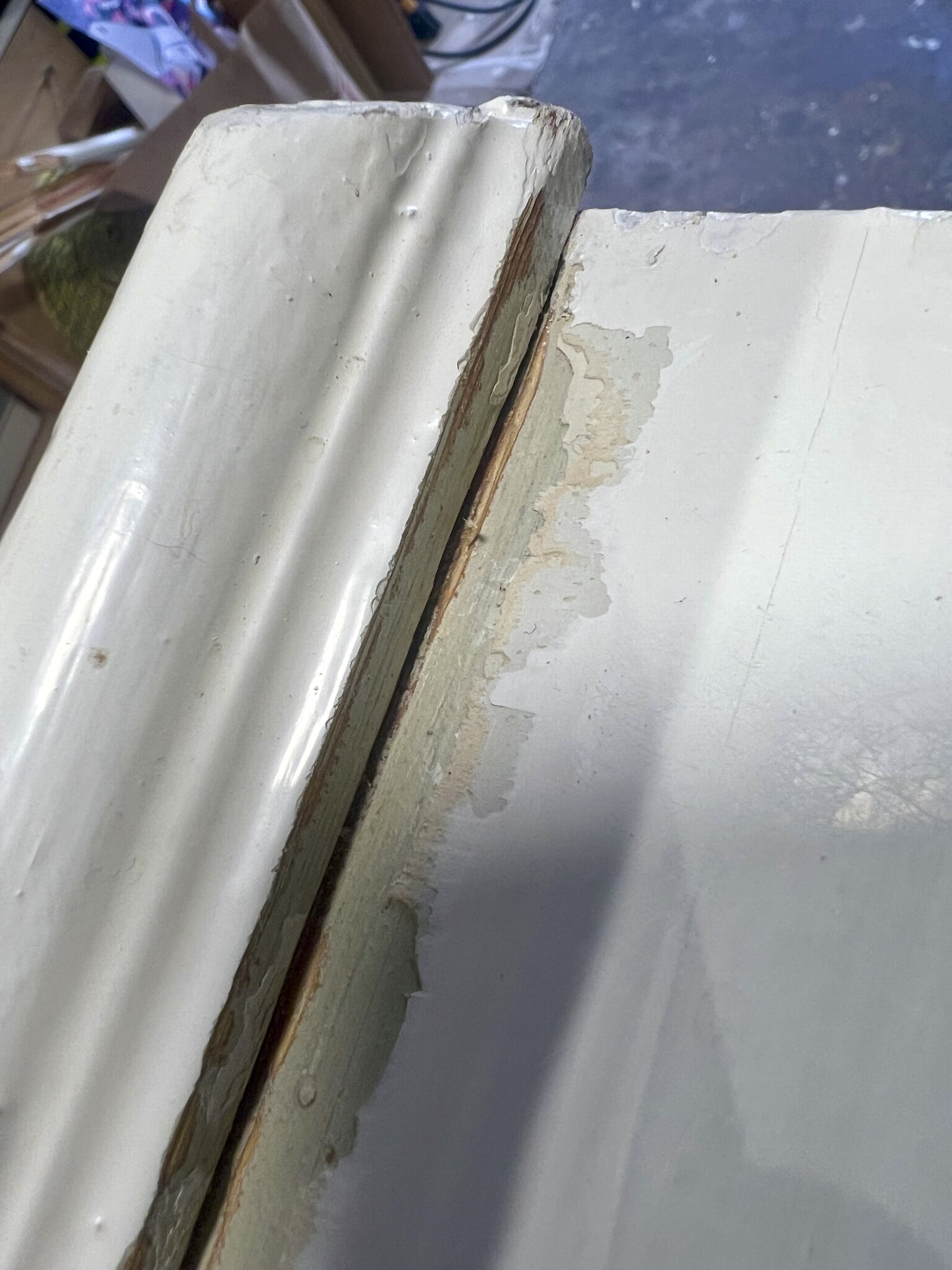 Tyvärr ser det ut som om det är övermålat men nån tjock plastfärg. Den kommer släppa i sjok från linoljefärgen underst. Man kan givetvis bara måla över, då försvinner lite av profilerna och det är svårt att inte få tidigare "flisor" och släpp kring speglarna snyggt. Man KAN spackla, men bara om det är få skador, annars blir det mer jobb med det än att ta bort all färg.