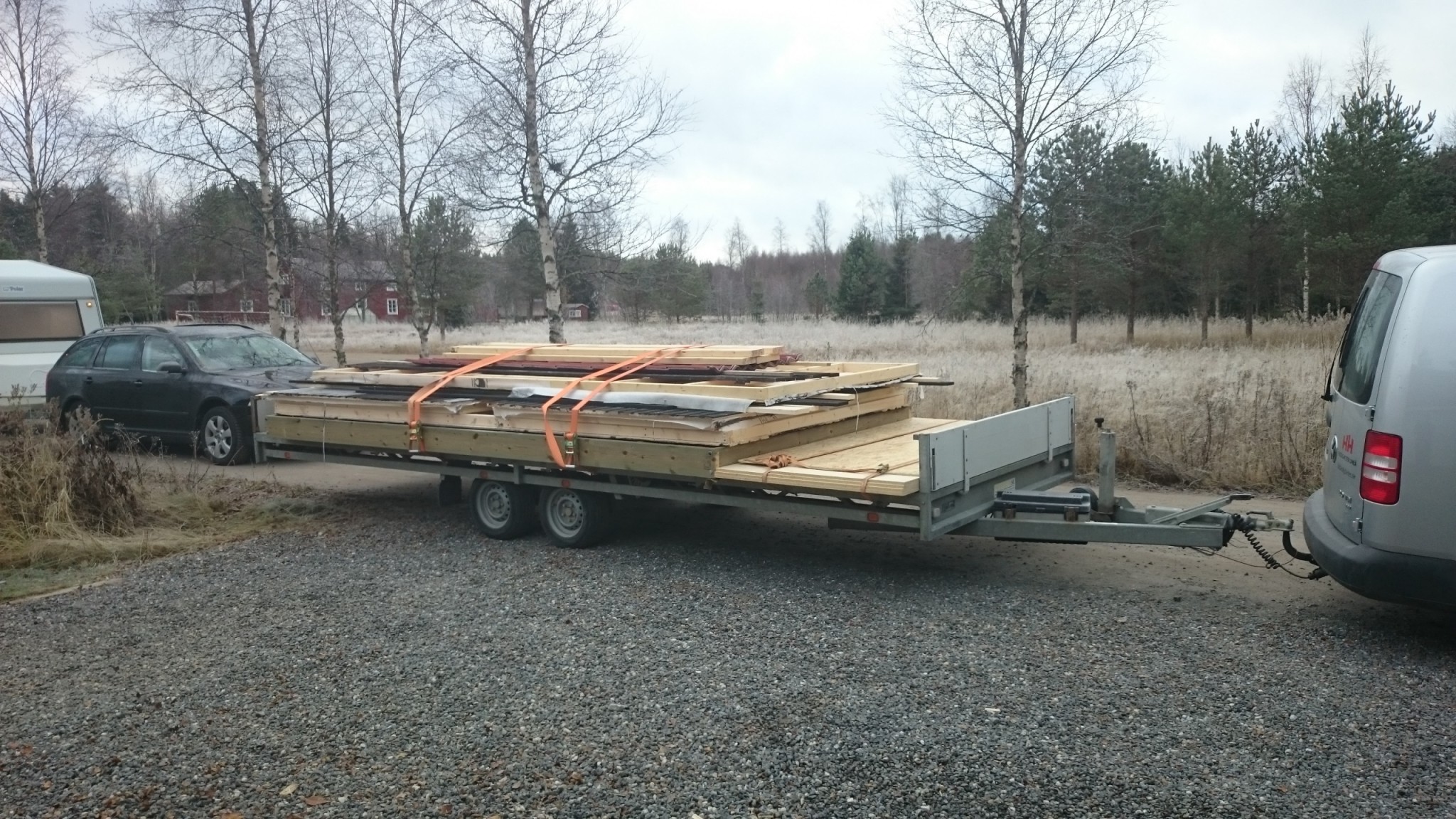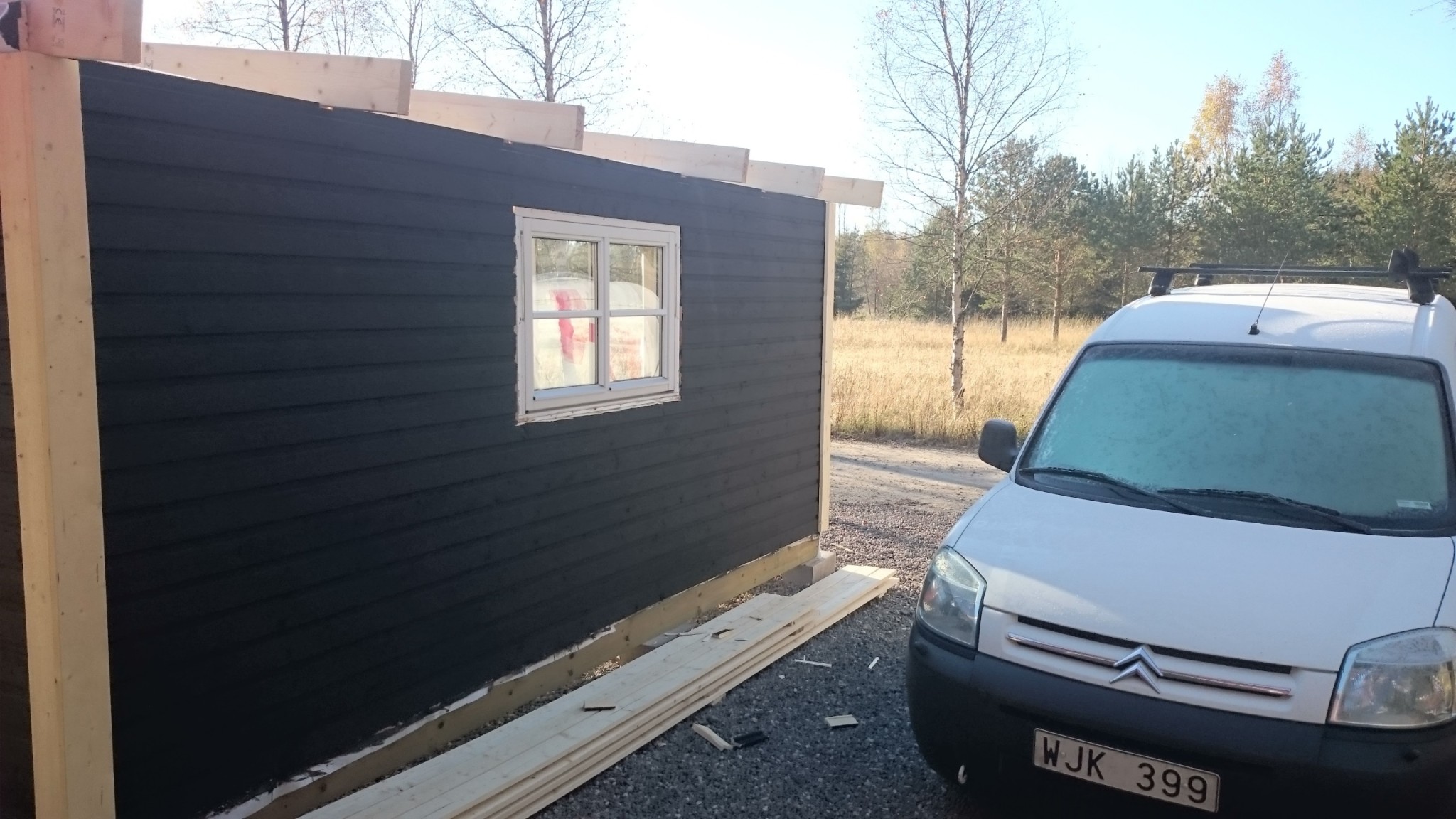 Väl på plats reste vi väggarna och isolerade golvet på bara någon timme. Hade gjort knutbrädor och underspikning klart hemma så det var bara montera med skruv. I med fönster, på med tak och sedan var den helgen slut.