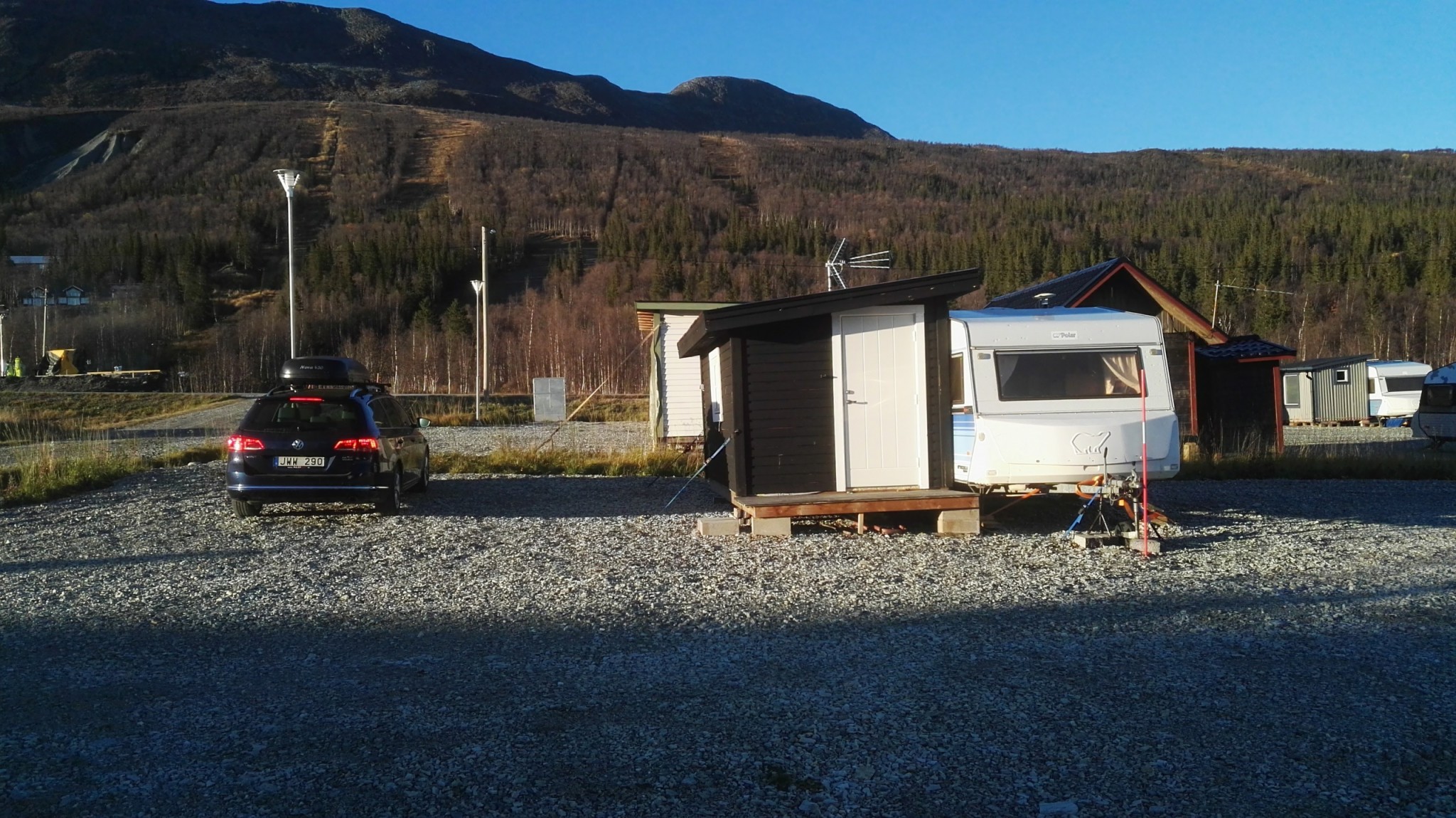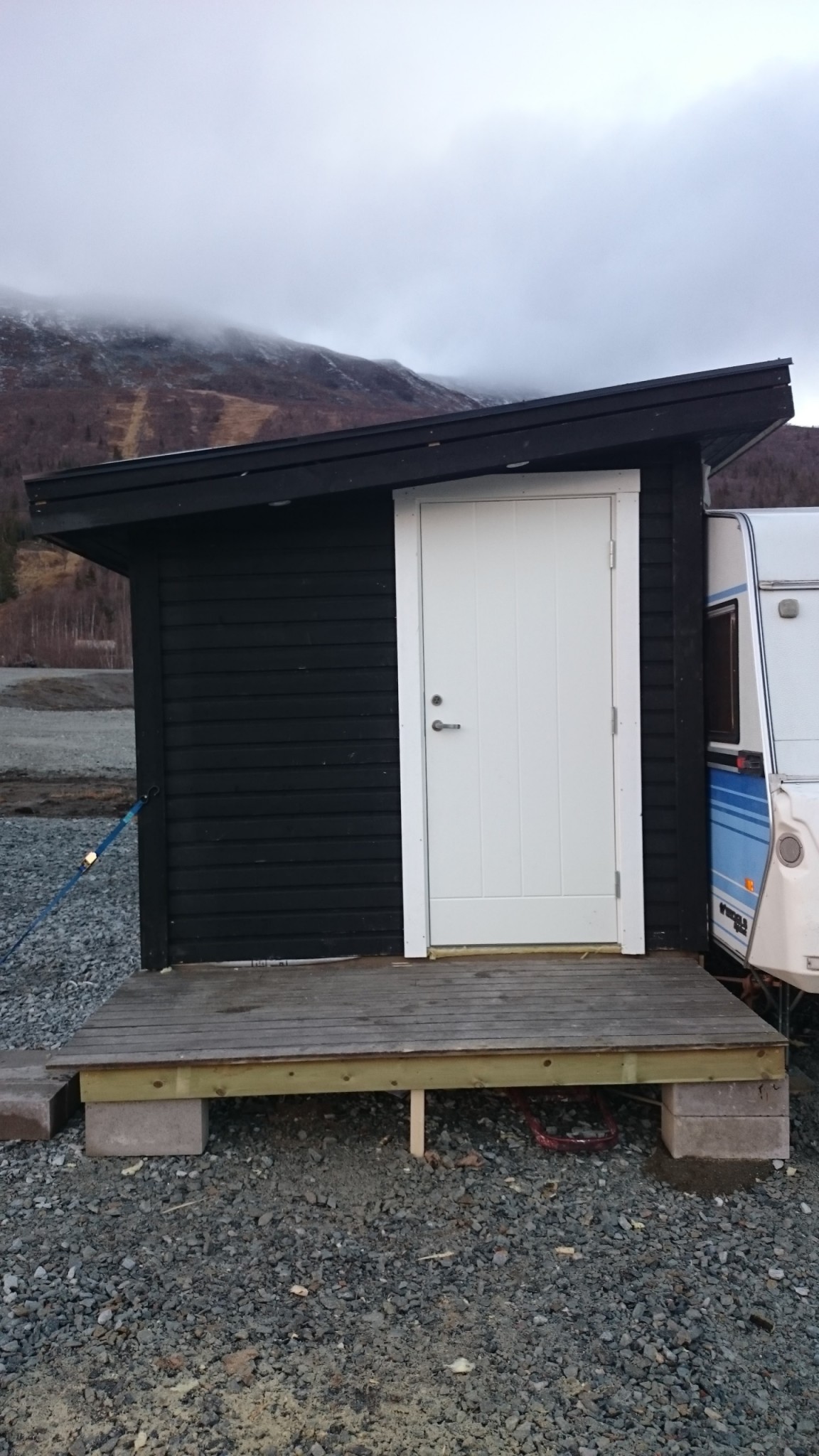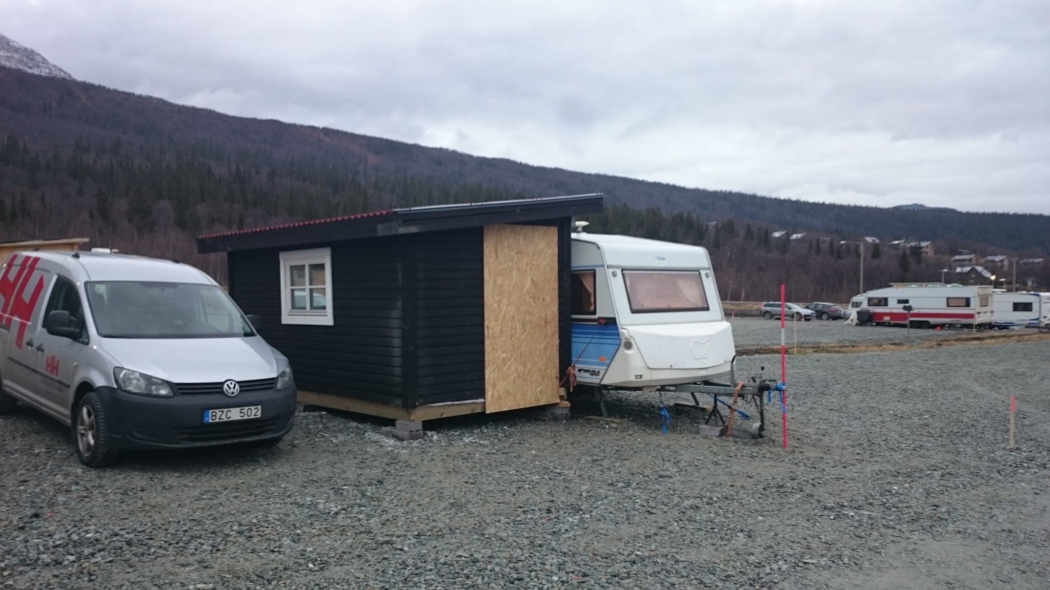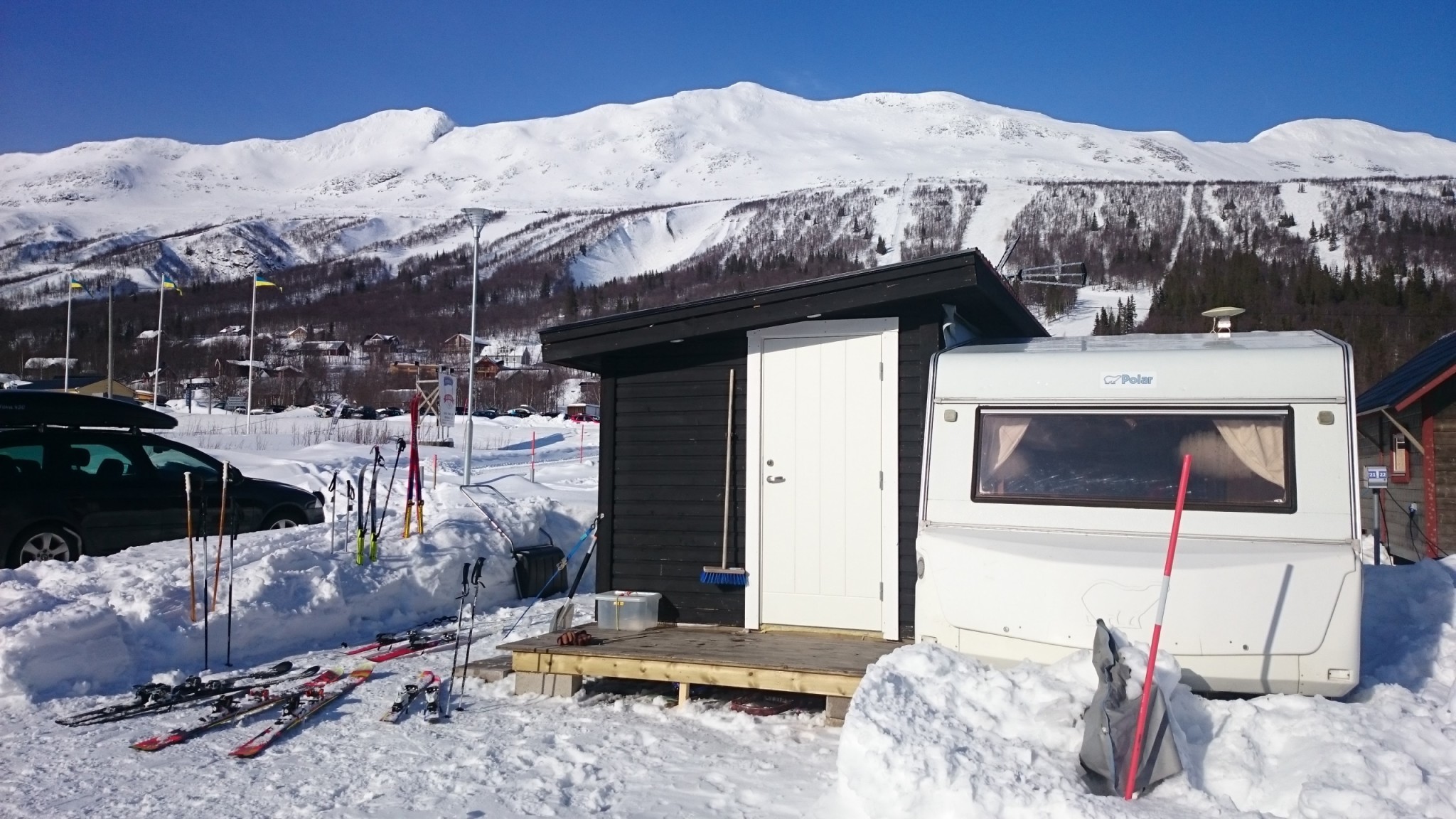 Den står i Kittelfjäll. Slussen gjorde jag helt enkelt genom att plasta in delar av en gammal skumgummimadrass som jag kilade in i mellanrummet mellan husvagn och spiketält. Sedan foder i öppningen så det inte syns. Blev helt tätt och funkade super hela förra vintern. Till den här säsongen har vi skaffat sk husvagnsgliders så vagnen kommer ännu närmare spiketältet.