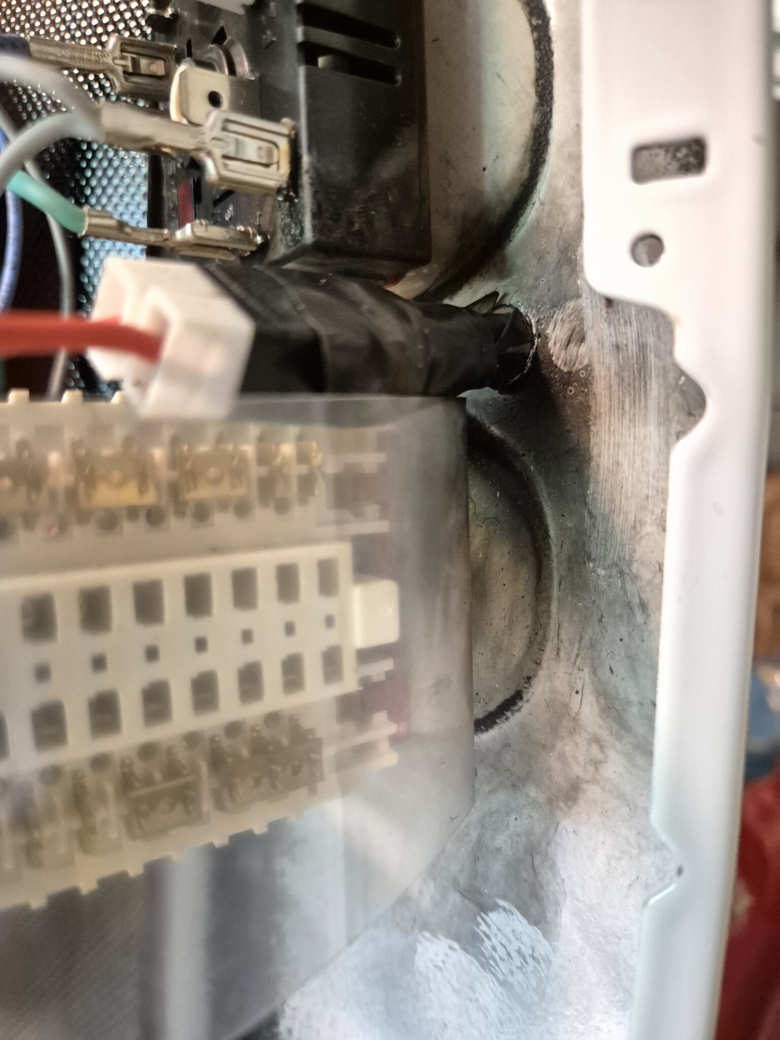 Tog bort bakstycket vilket var enkelt, inga uppenbara överslag har skett men ännu inte arbetat mig fram till fronten med alla vred osv, inte heller demonterat själva hällen. Bara kikat in från baksidan och inget abnormt kan ses.