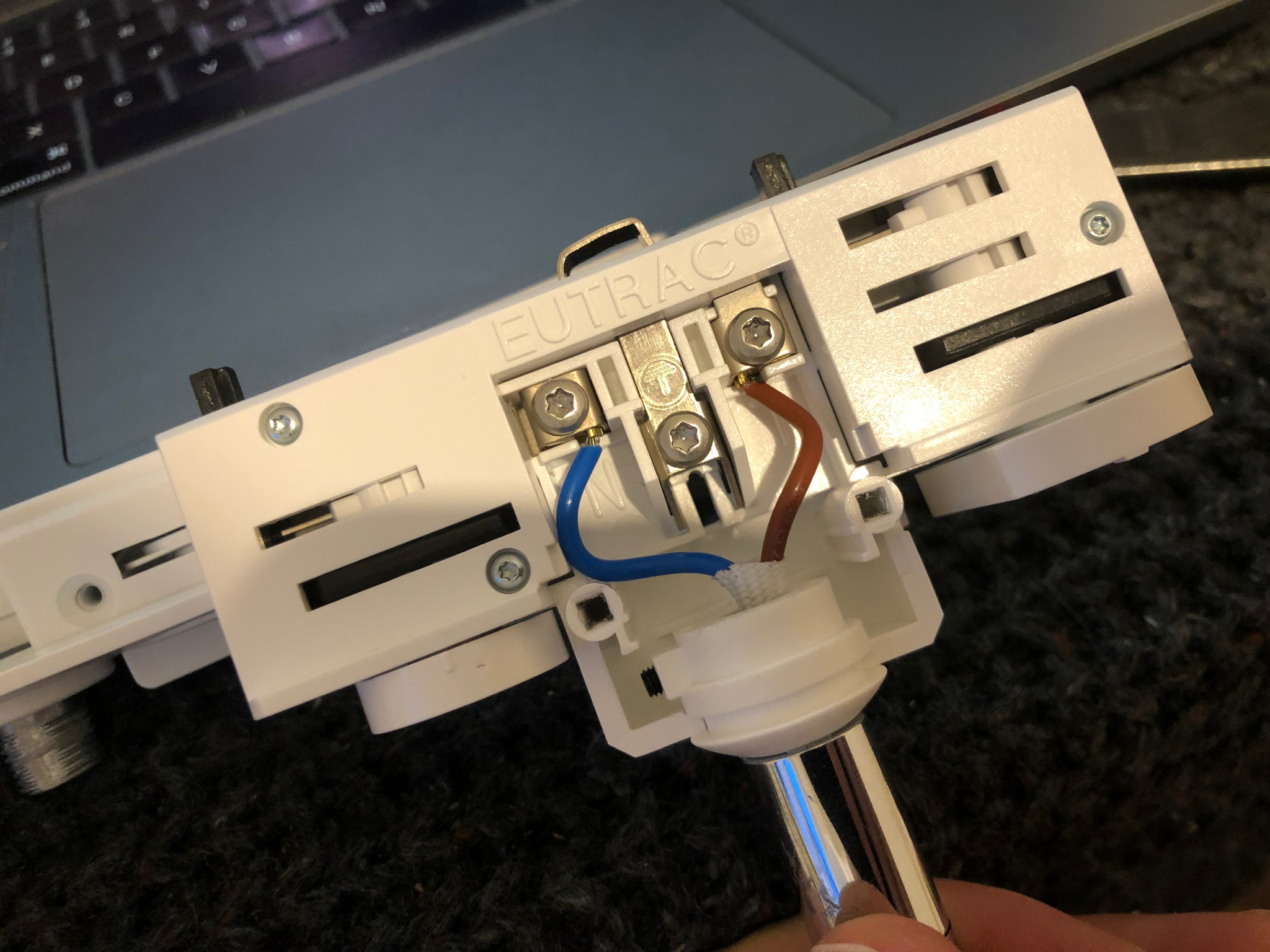 Själva inkopplingen är inget problem. Vanligaste adapter för skenan är 1-fas. Anledningen till de tre faserna är för att kunna ha flera strömbrytare till gemensam nolla.