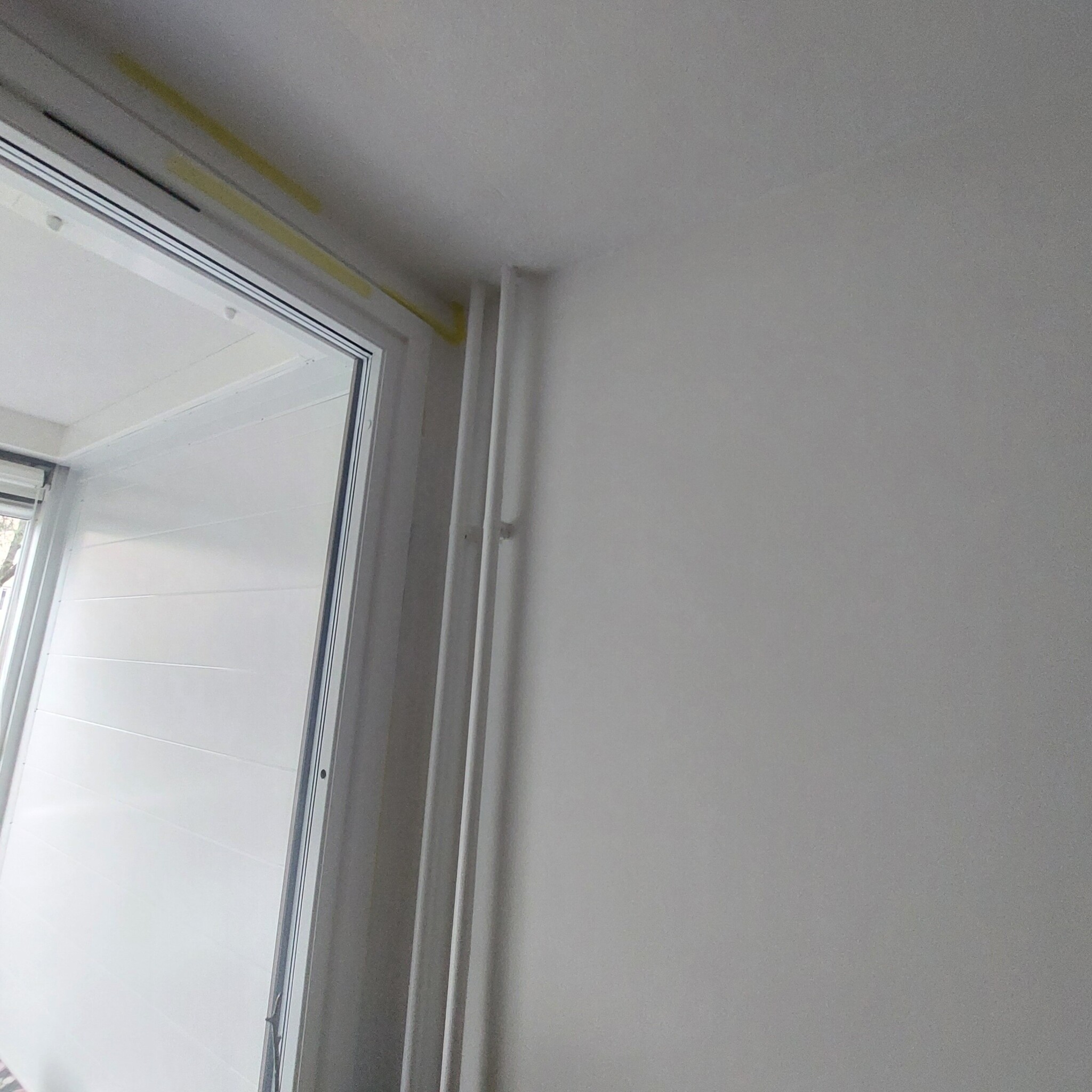 Jag antar att de gula ränderna är tejpen och den nedre ser ut att vara mitt på fönsterfodret och är fodret sprucket så byter man det. I vinkeln mellan vägg och tak använder man en övermålningsbar flexiblel fog, t.ex. kallad målarfog, som man målar över.