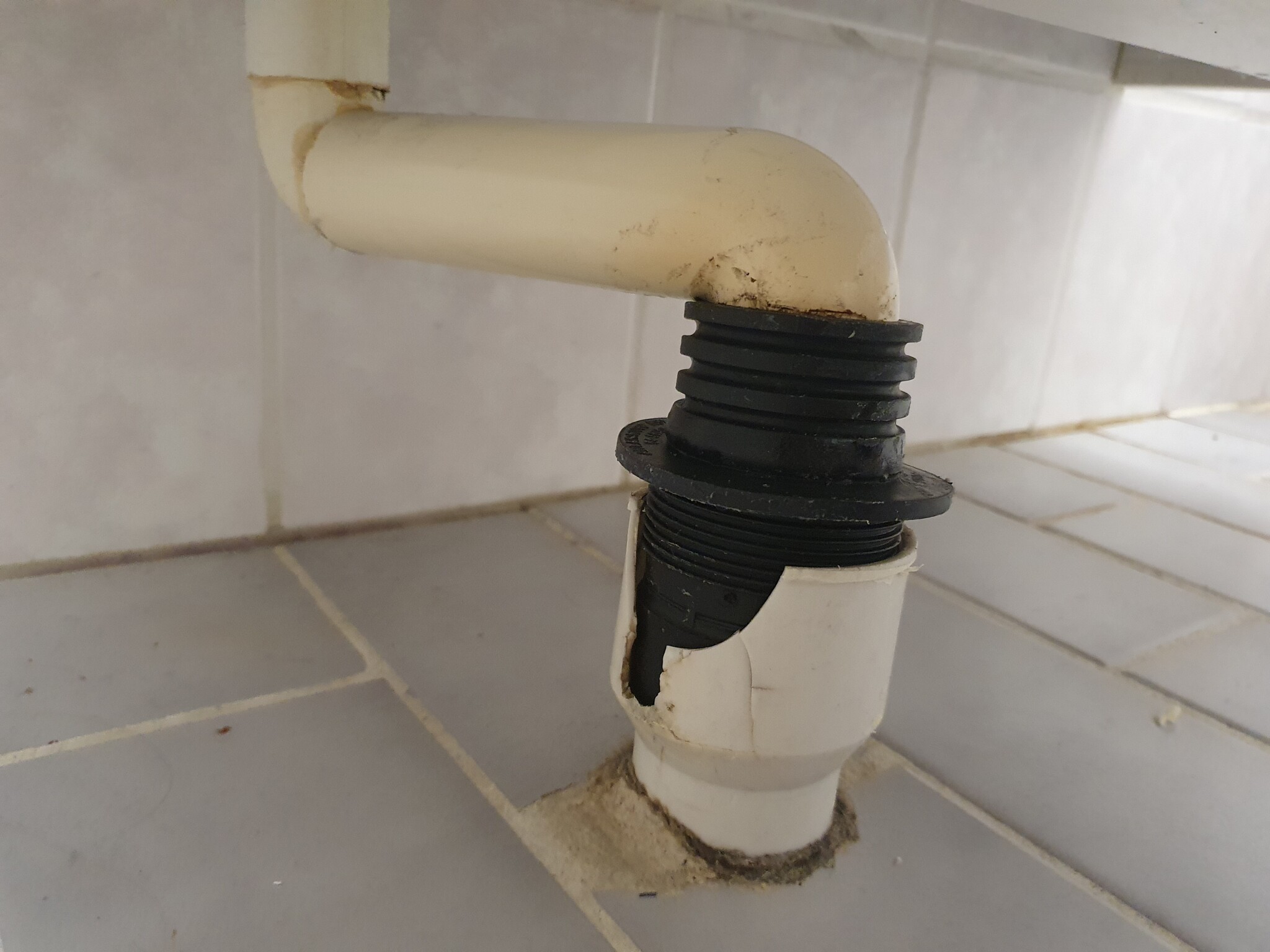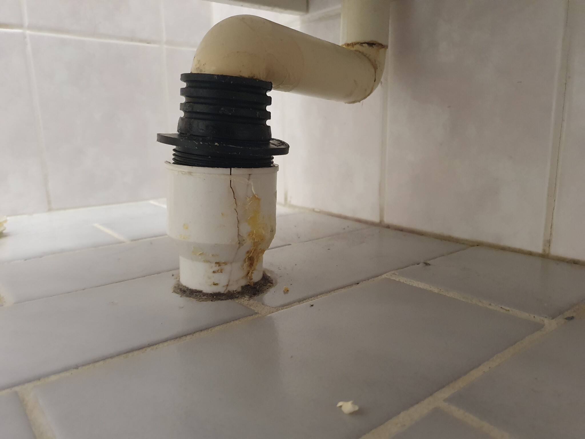 Avloppsröret i plast till handfatet som går ned i golvet i vårt badrum är sprucket. Detta är under kommoden, som om nån råkat sparka sönder det