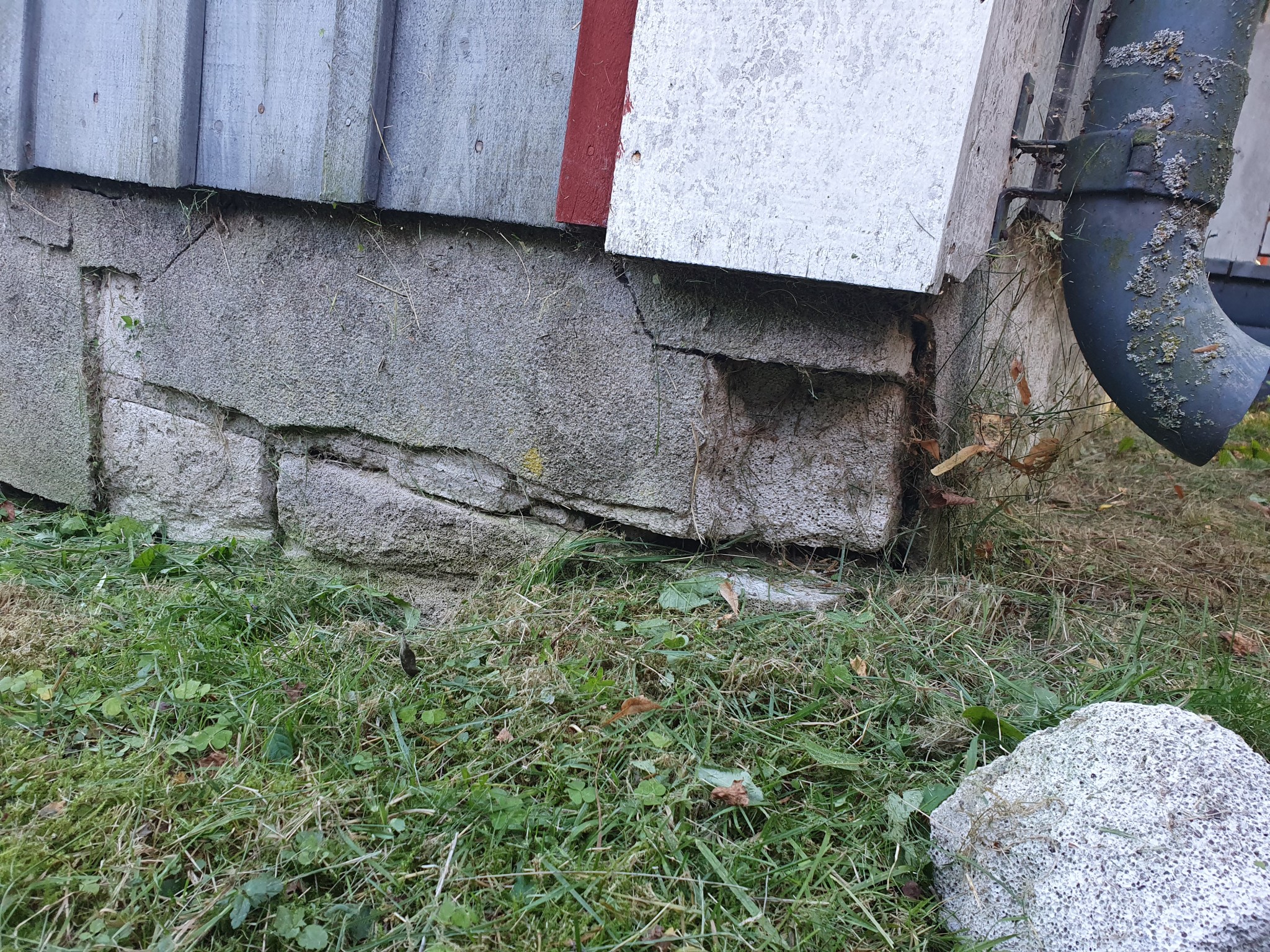 Två av de yttre hörnen har rejäla frostsprängningar och golvet inne sviktar lite i hörnet som är värst utsatt.