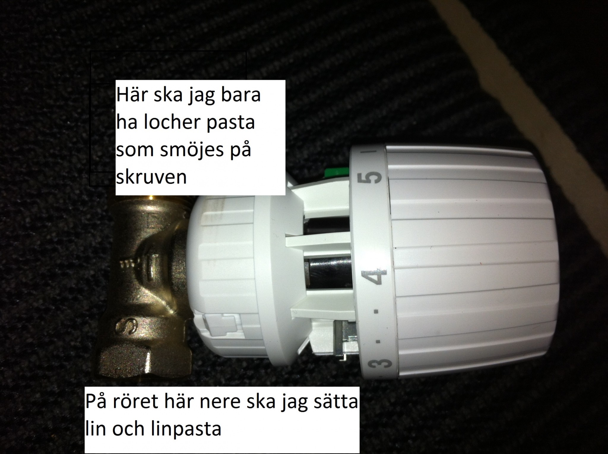 Bilden stämmer perfekt. Du behöver inte hänga upp dig på allt repande och raspande, lägg pasta på den gamla röränden och linda på lite lin medurs sett från änden så blir det helt perfekt. Pasta runtom så att gängan fylls ut och sen lin 2-3 varv (i princip så gängan fylls med lin varken mer eller mindre), kan du ordna till linet så det i stort täcker hela bredden på gängan och inte läggs som ett "snöre" är det allra bäst. Svårt att misslyckas med detta och annars får man testa några gånger så sitter det sen.