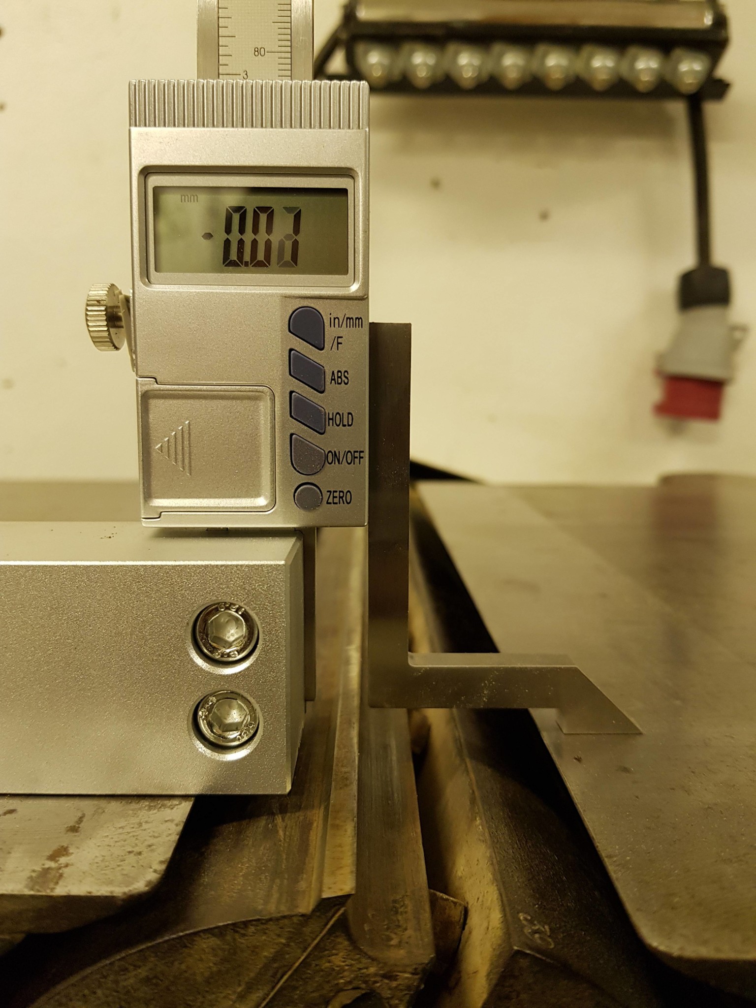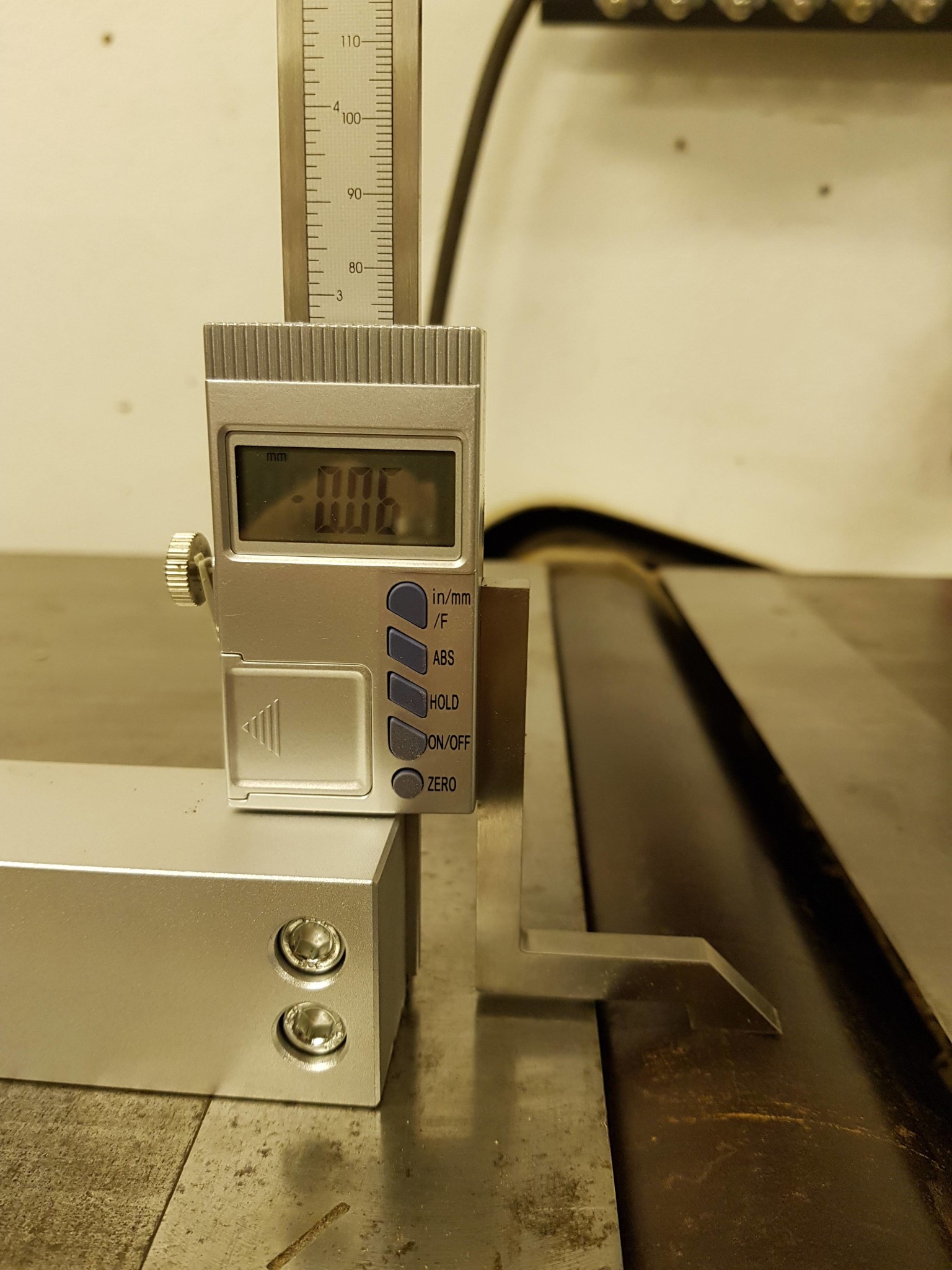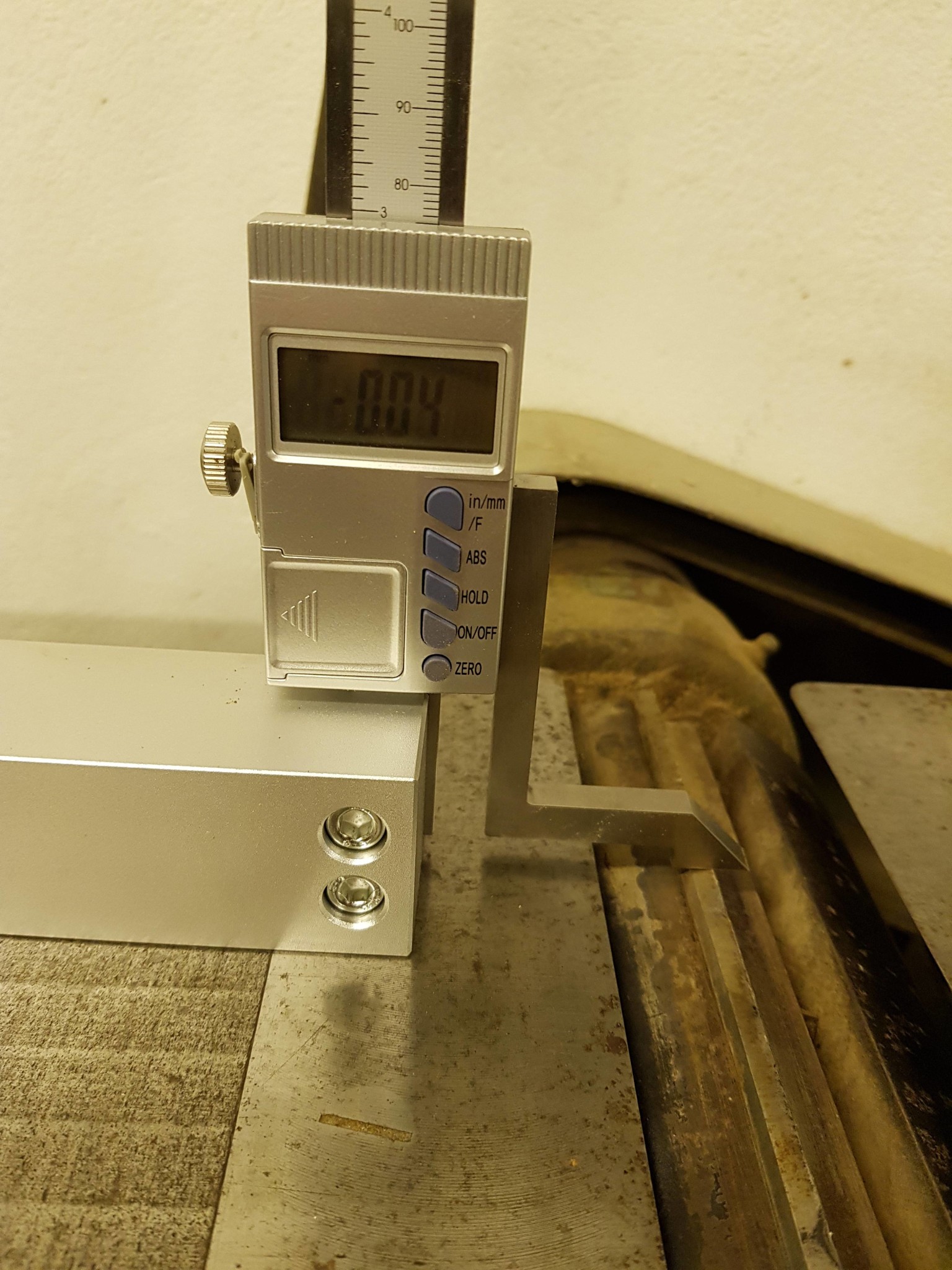 Mätaren är nollställd för att visa diff i djupled. Den ligger så klart en bra bit under utmatningsbordet och hyvelstålen ligger nu väldigt nära i nivå med utmatningsbordet.