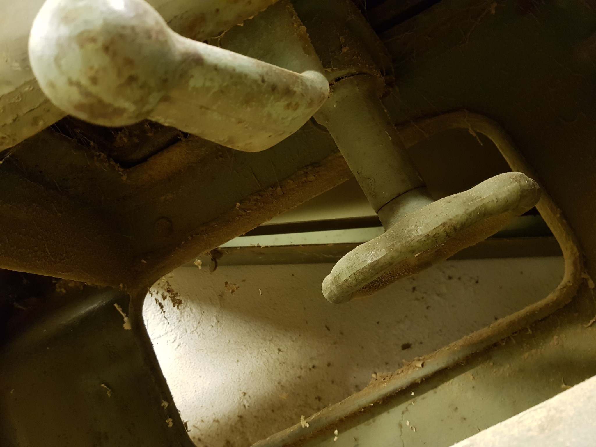 Kollar jag på undersidan hittar jag inget för att justera detta bord. Undertill finns en stor ratt som jag tolkar det som är för att lossa bordet och sedan kan man via en annan ratt höja och sänka bordet. Motsvarande finns också på utmatningsbordet.
