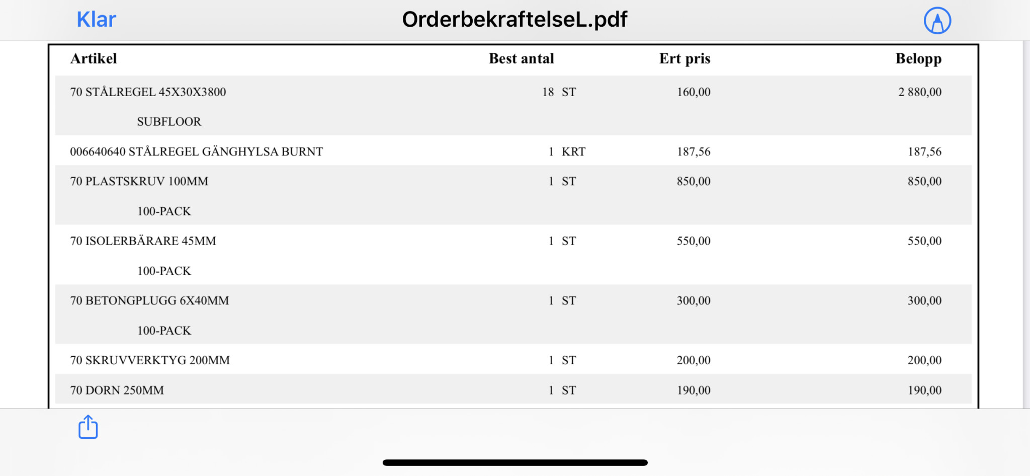 Tyvärr kan jag inte dela upp vad som kostade vad mer än att det där var materialkostnaden, då jag inte har fakturan här.