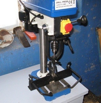 Så jag blev helt enkelt tvungen att tänka om och köpte då nedanstående lilla behändiga (och billiga) bordsborrmaskin tillsammans med en annan typ av tillsats. Och det funkar alldeles perfekt för just mina behov.