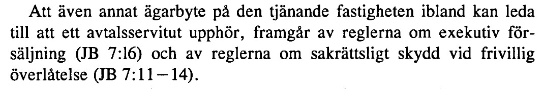 Jag har också funderat över detta i några dagar nu. Och enligt doktrinen att döma är det det själva avtalsservitutet som upphör när en av servitut belastad fastighet överlåts. Detta trots att lagtexten (7 kap. 11, 18 §§ är formulerad med fastighetsägaren och inte fastigheten som utgångspunkt)A adron skrev: