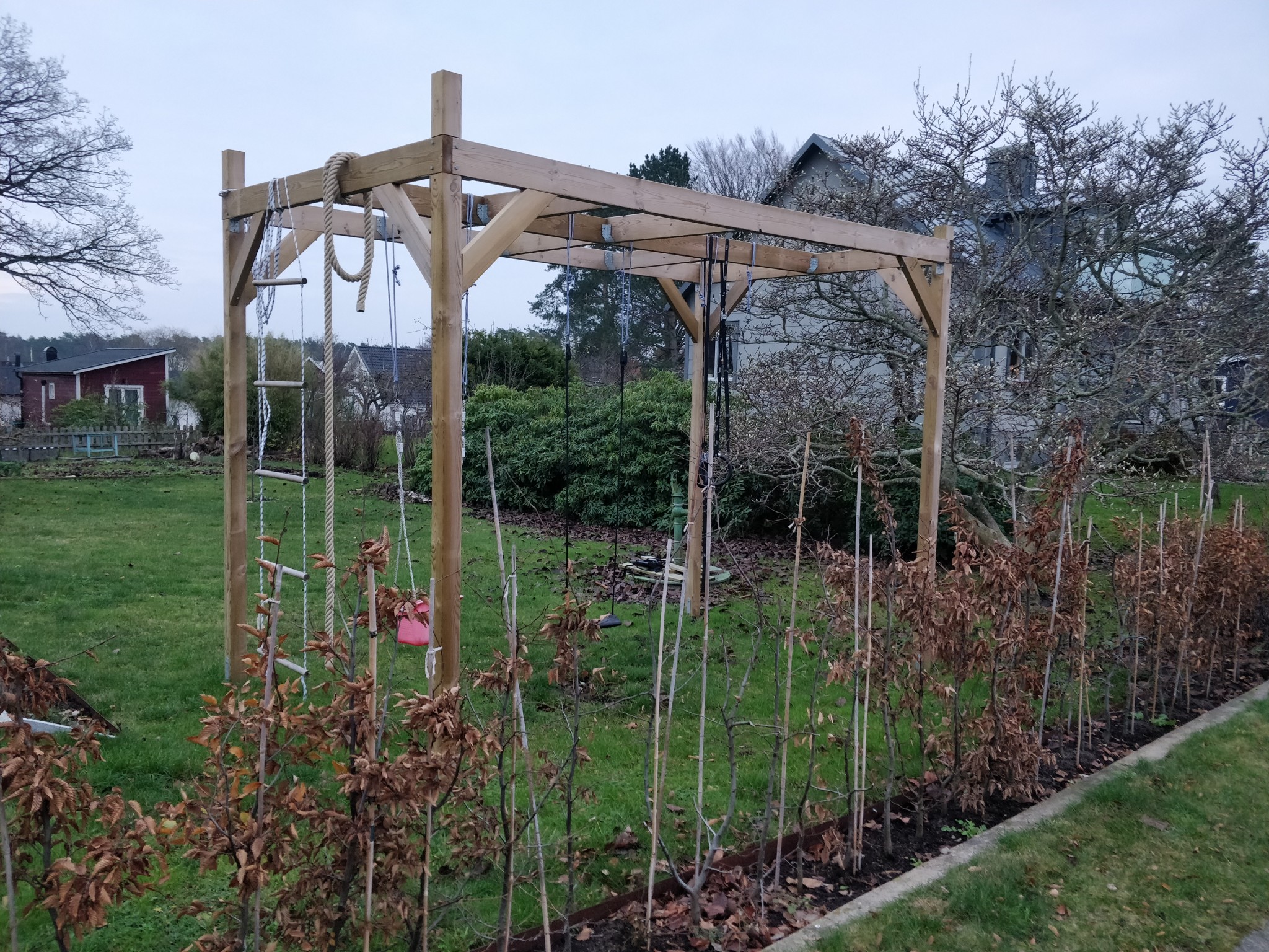 Tvärstagen är 50cm och räcker inte till för att motverka gung när vuxen klättrar. Allt förankrat med 70cm höga betongblock nedgrävda.