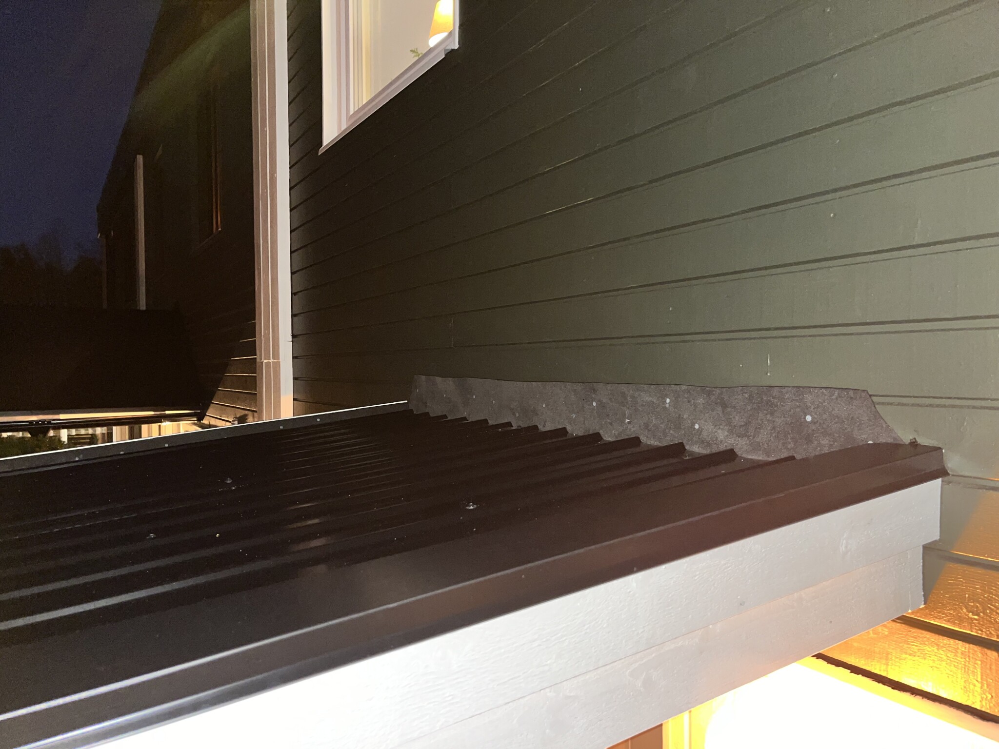 Jag bygger ett enkelt skärmtak över entrén och ska sätta vindskiveplåt och ståndskiva mot ytterfasad.