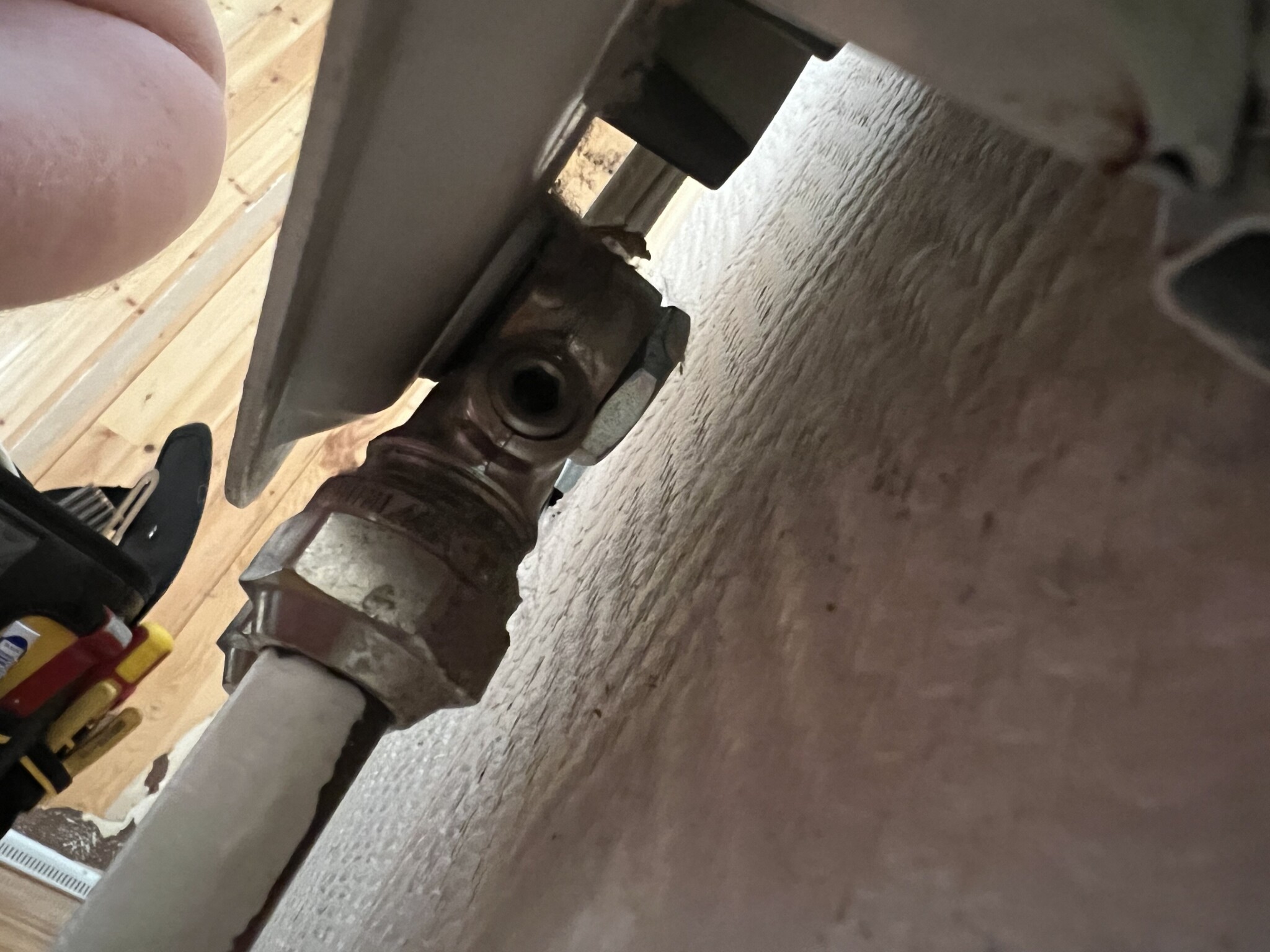 Finns en insexskruv som jag provade att lossa på, då kom en vattendroppe, vågade inte skruva mer men det kanske är för avstängning?