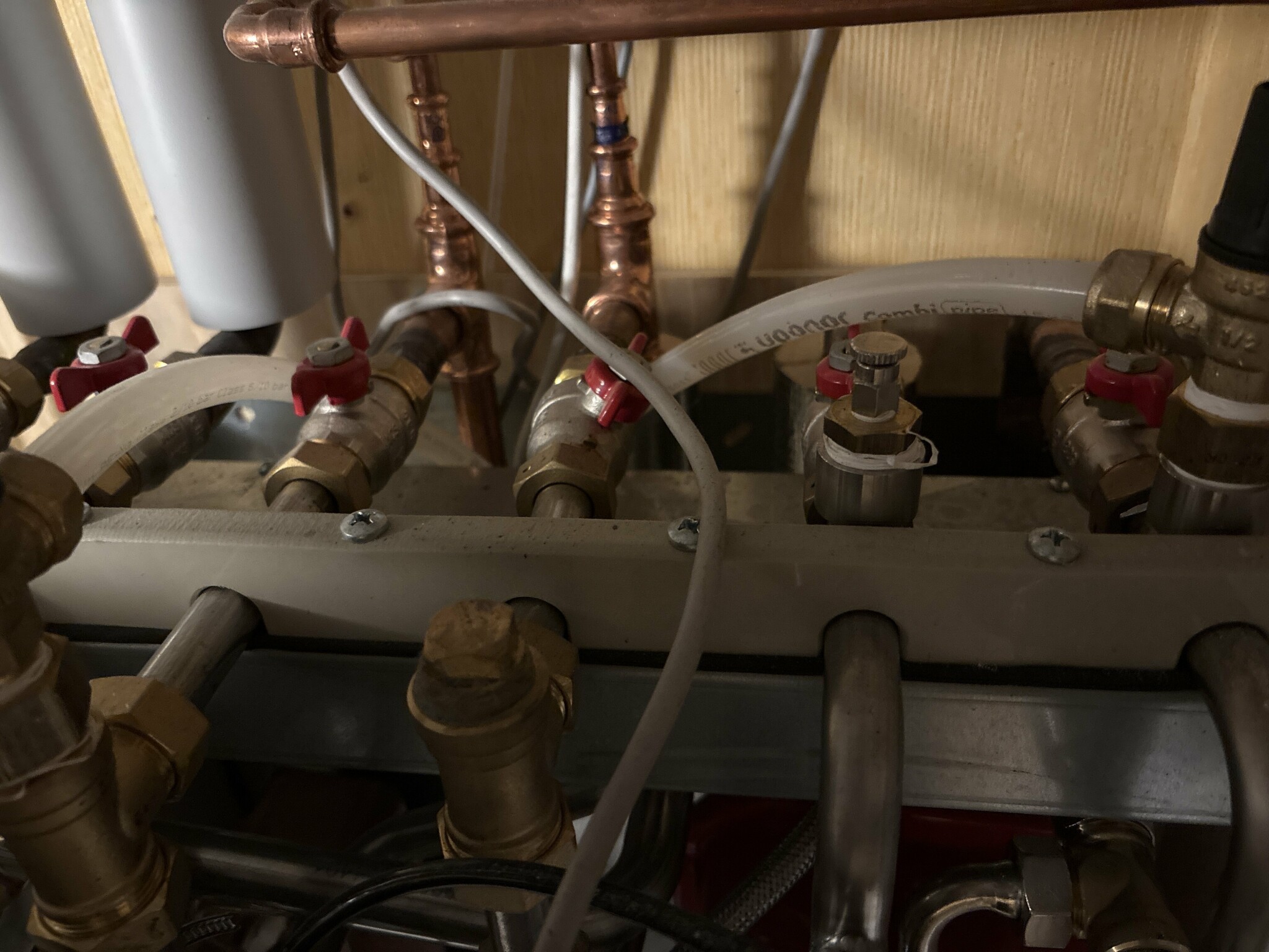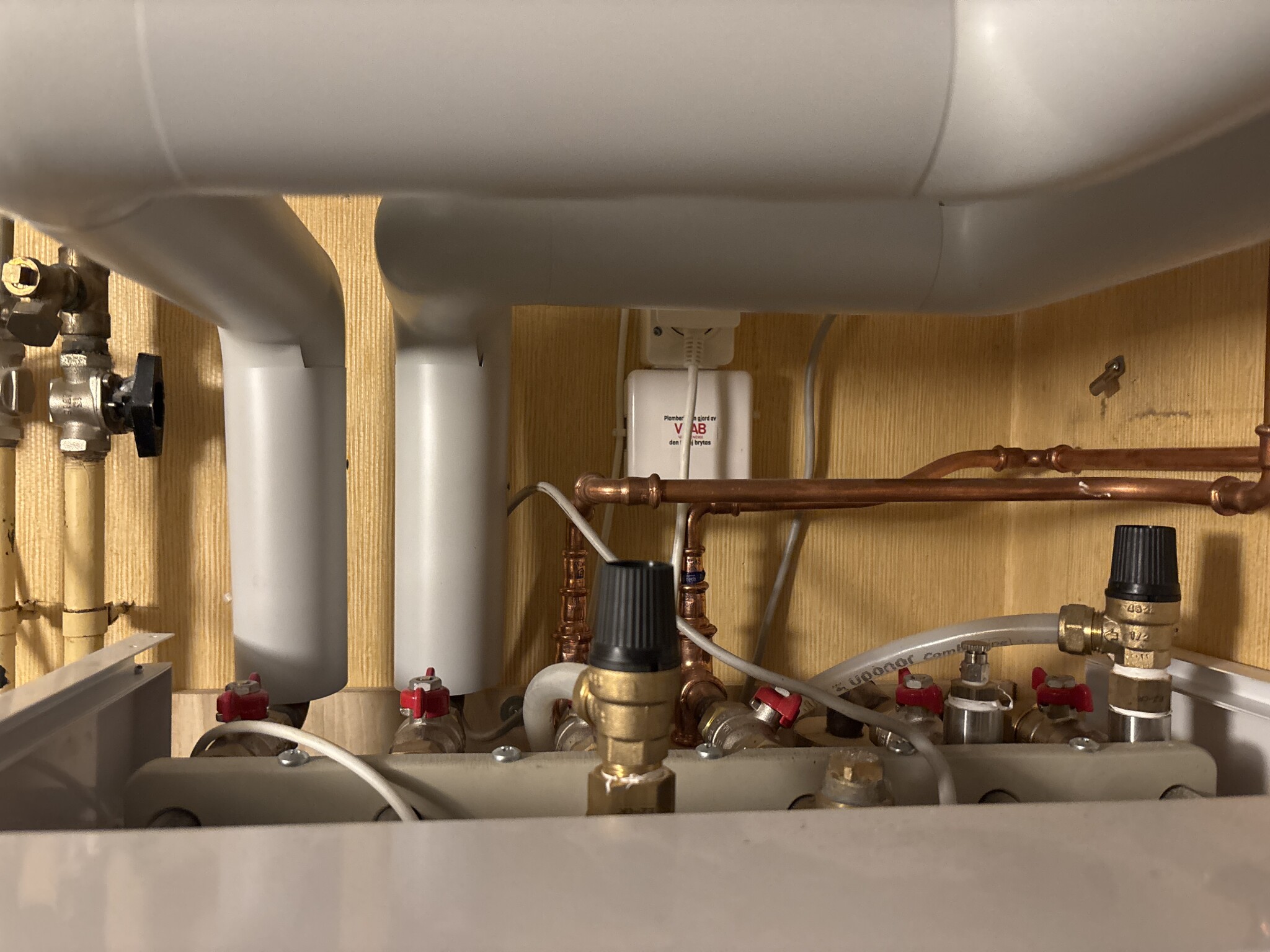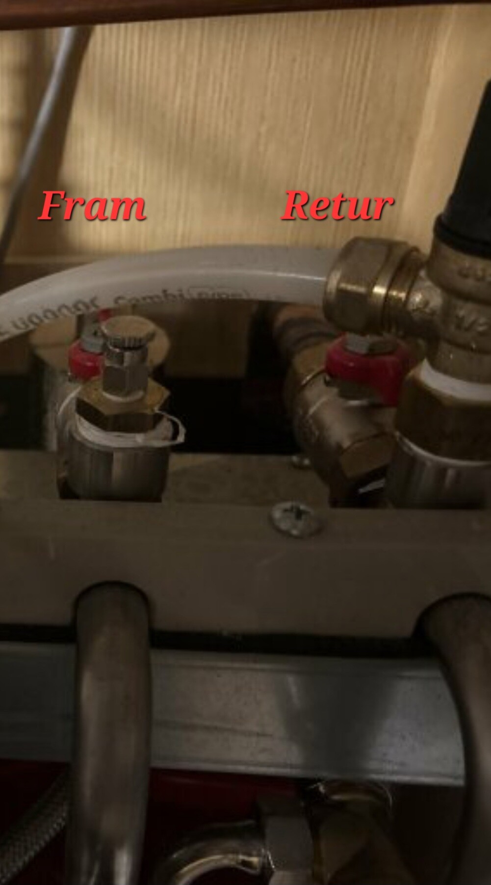 Släppa ut övertrycket i radiatorkretsen via säkerhetsventilen (längst till höger).