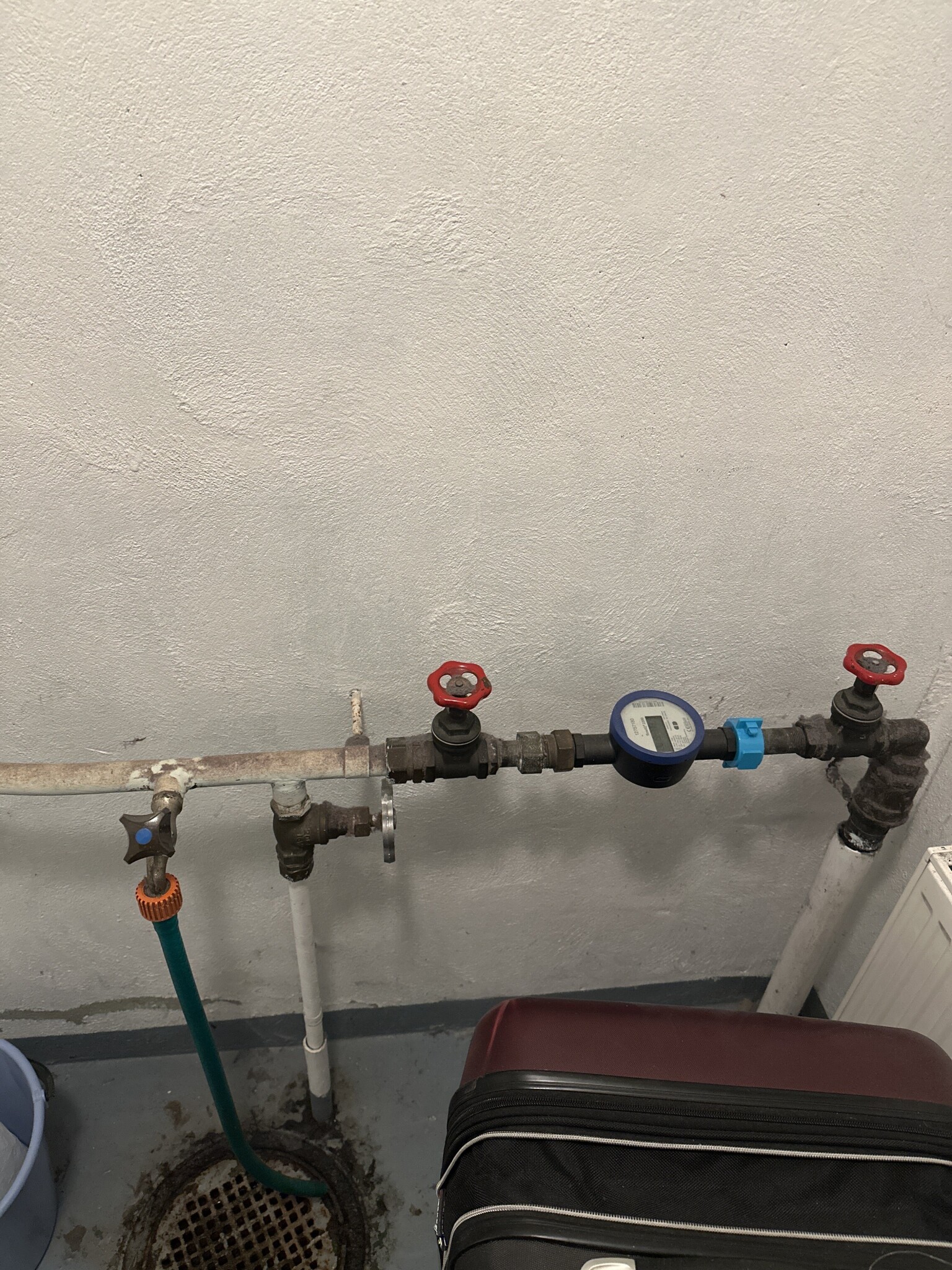 De två röda rattarna är för att stänga inkommande vatten och kunna byta vattenmätarrn. Höger sida kommer från gatan, vänster fördelar ut i huset. Men för att hitta vilket rör som leder till utkastaren får du kanske leta längs alla synliga rör vilket som är mest troligt.