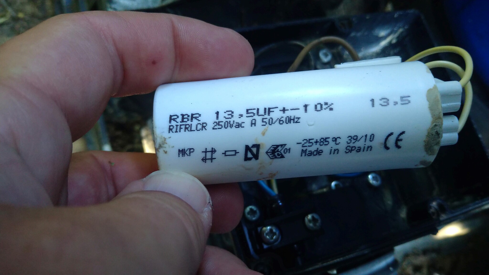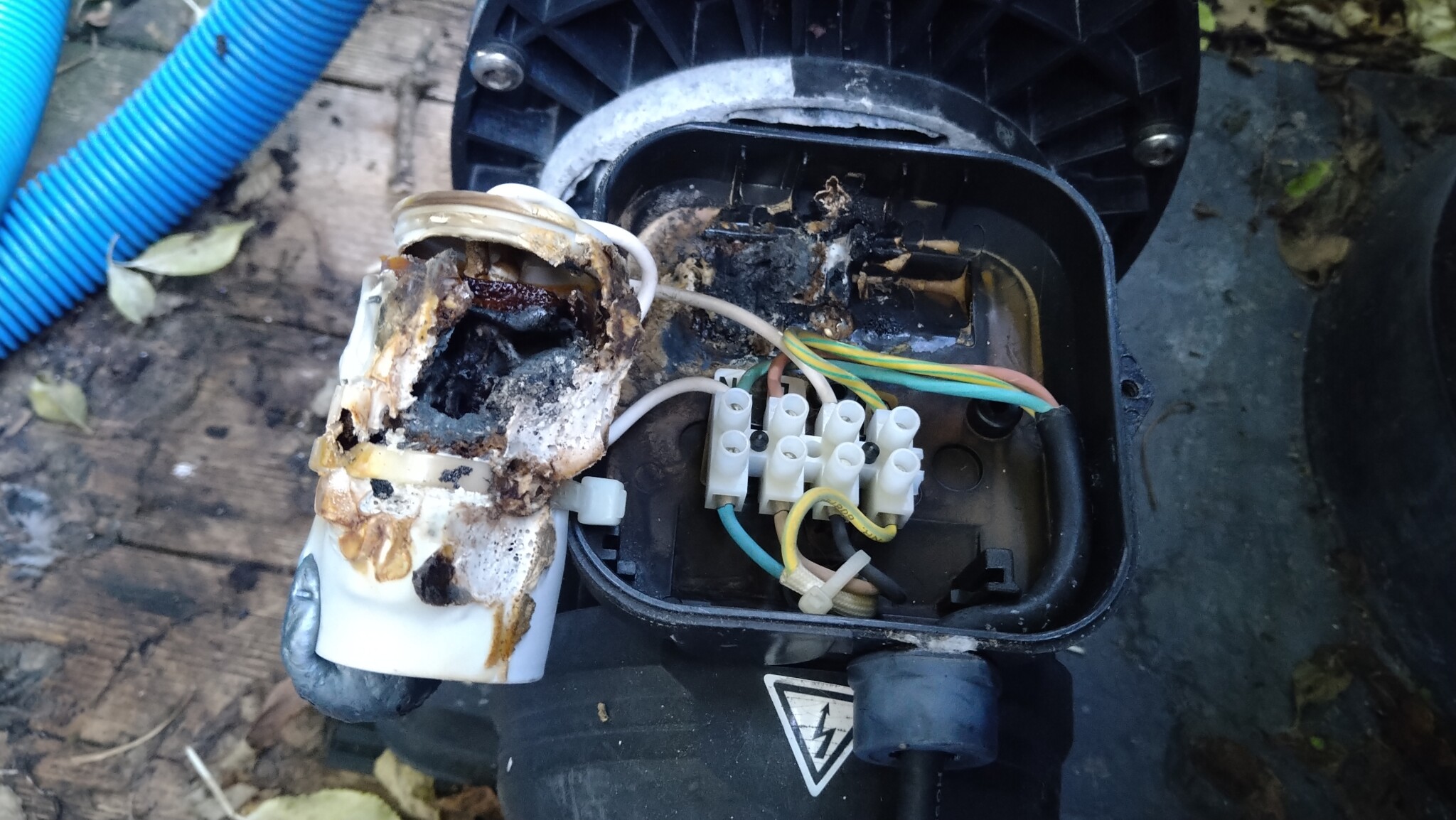 För att vara tydlig så skedde alltså detta i en pump där jag ännu inte hade gjort några förändringar/byten av komponenter. Jag upptäckte att jordfelsbrytare hade löst ut, att poolpumpen stod still, att en slang hade lossnat och att kondensatorn såg ut så där.