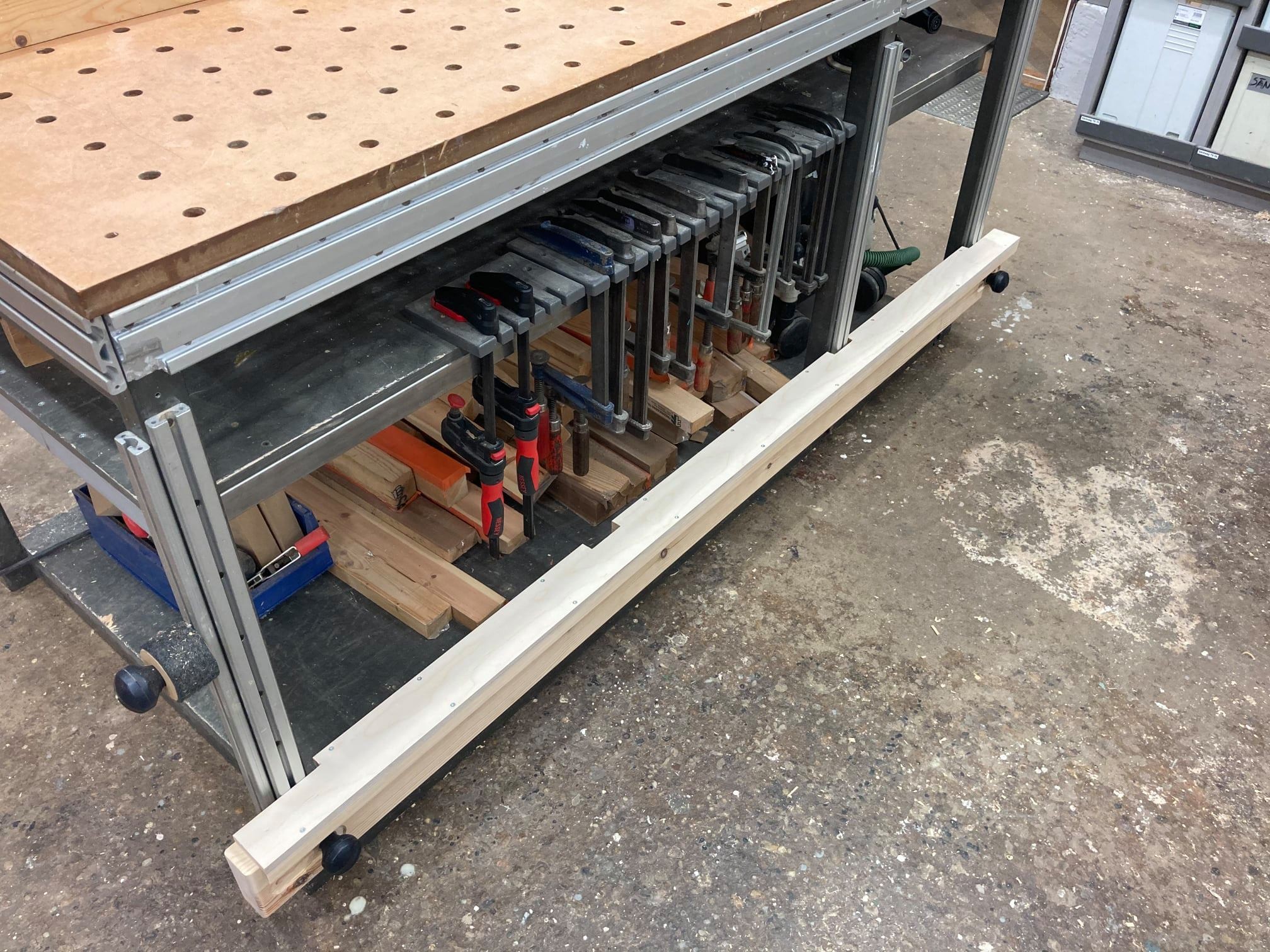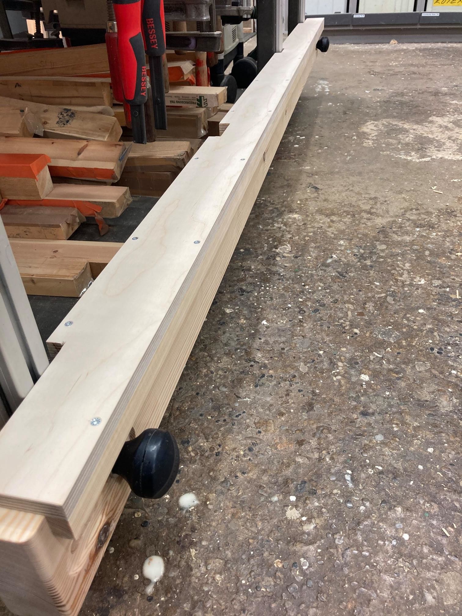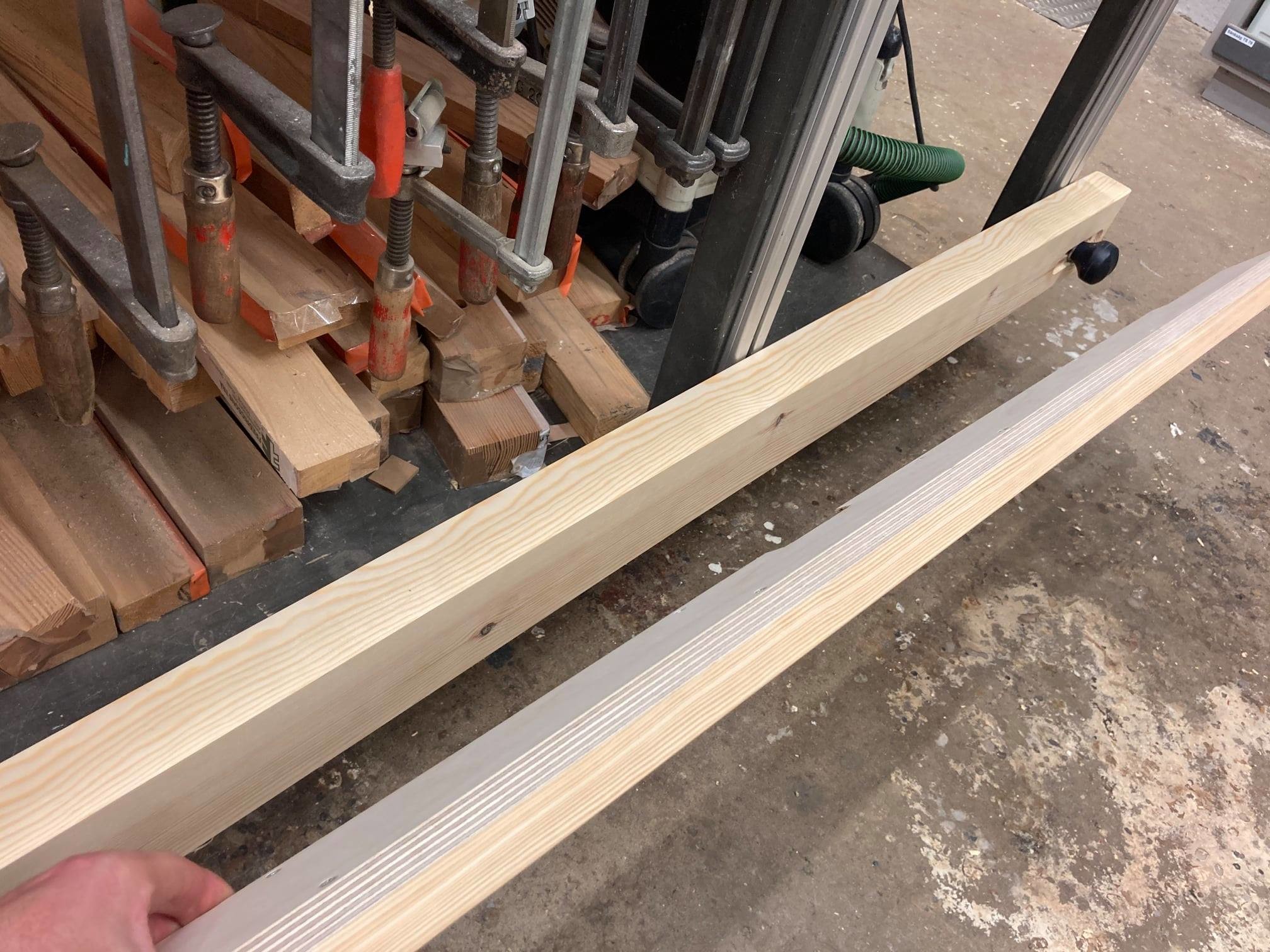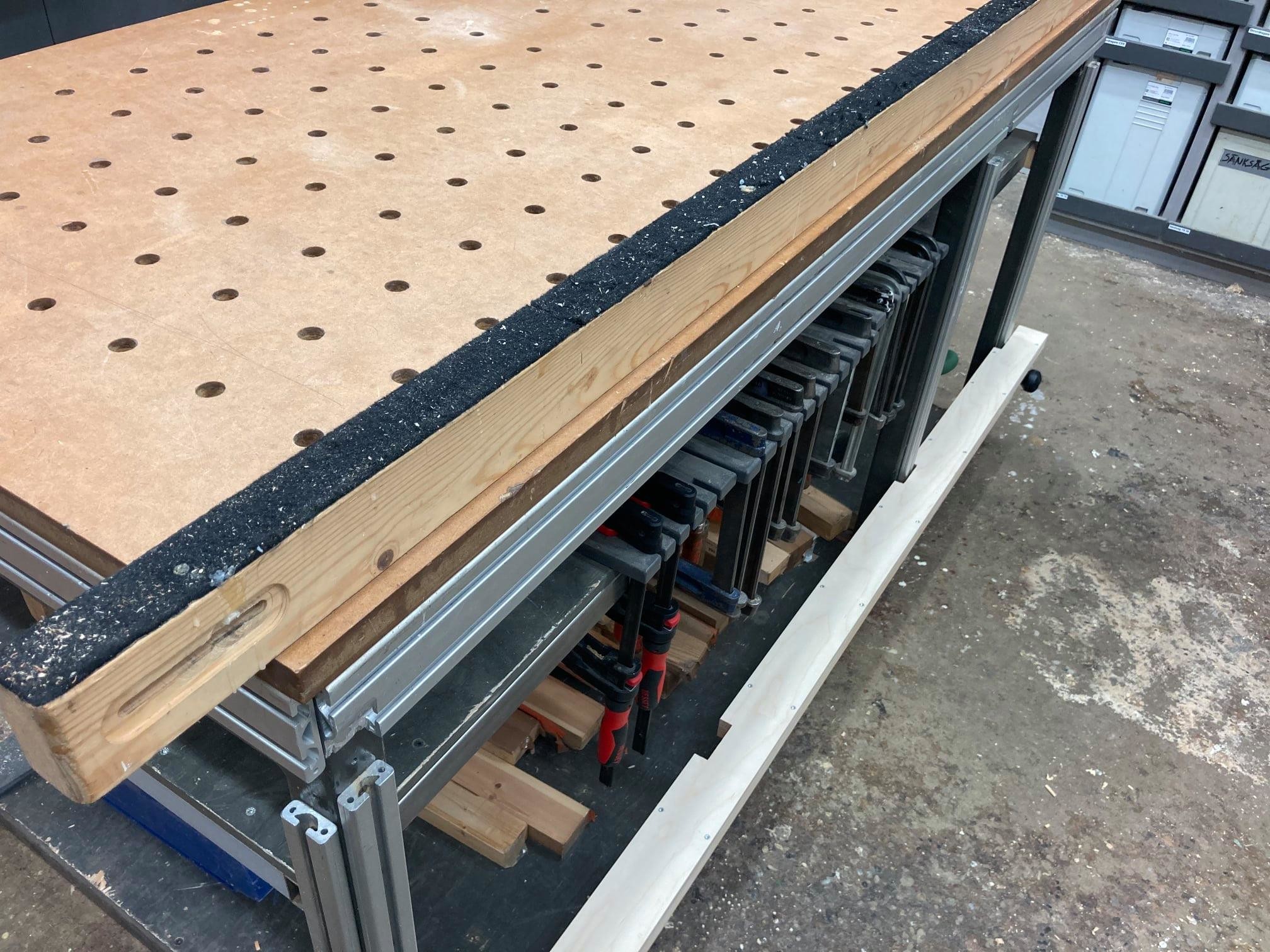 Uppgradering. Bordet har nu använts i många tusentals timmar. Balken på sidan av bordet (används i posten innan till att ställa grinden på) har en filtbeläggning på ovansidan, vilket är bra. Tyvärr blev den med tiden full av damm och limspill, vilket inte alls var en mjuk bra yta att ställa saker på. Idag har Jesper gjort en ny, med ett "lock" ovanpå. Tanken är att man normalt använder locket och när man har något ömtåligt så lyfter man bort det och undertill finns balken med filt på. På bilderna är filten ännu inte fastlimmad.