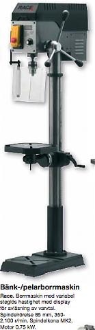 Det är en ganska stabil (kina?)maskin, chucken sitter fint och lagren verkar inte glappa. Hittade den på nätet, LUNA har den. Race. MK2 spindelkrona, 85 mm borrdjup, steglös 350-2100 varv. Jag tror den duger fint för mina anspråkslösa ändamål, bara att slippa flytta omkring remmarna är värt det hela.