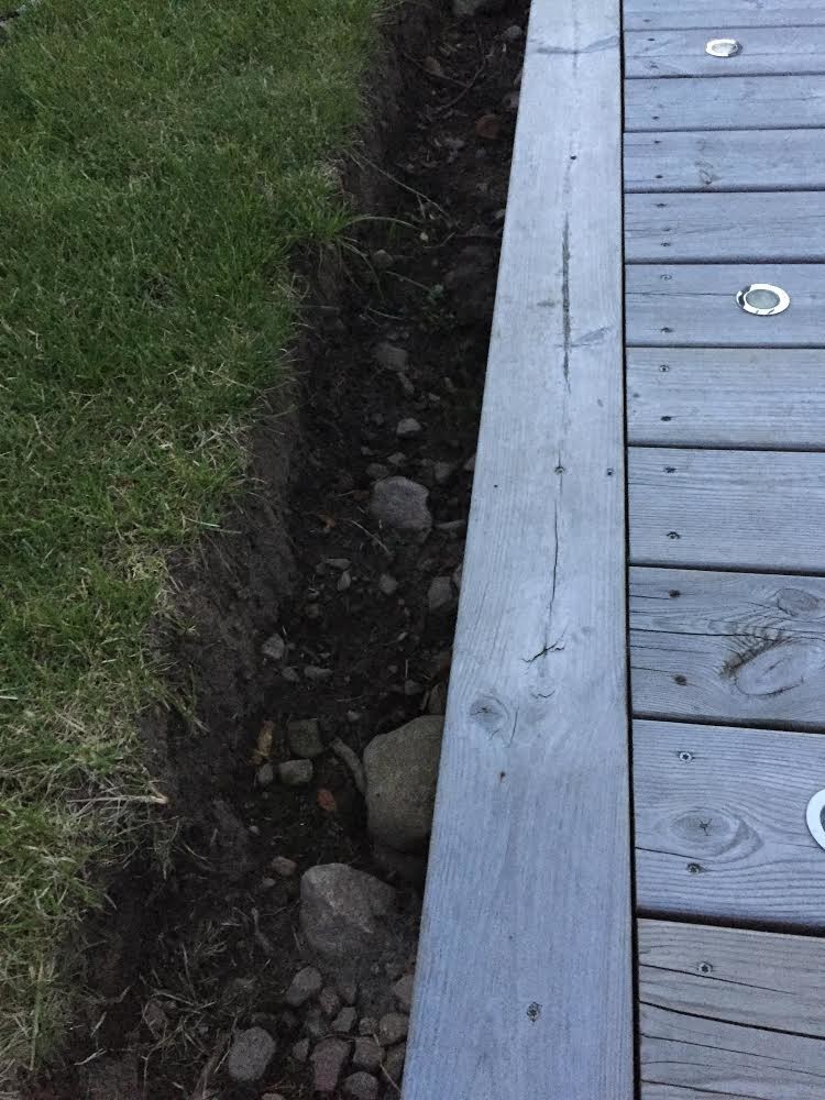 Dags att fixa ett projekt som inte blivit gjort i sommar, avslut runt om trädäcket. Frugan vill ha någon slags marksten och sjösten intill trädäcket och det borde gå att fixa relativt enkelt.