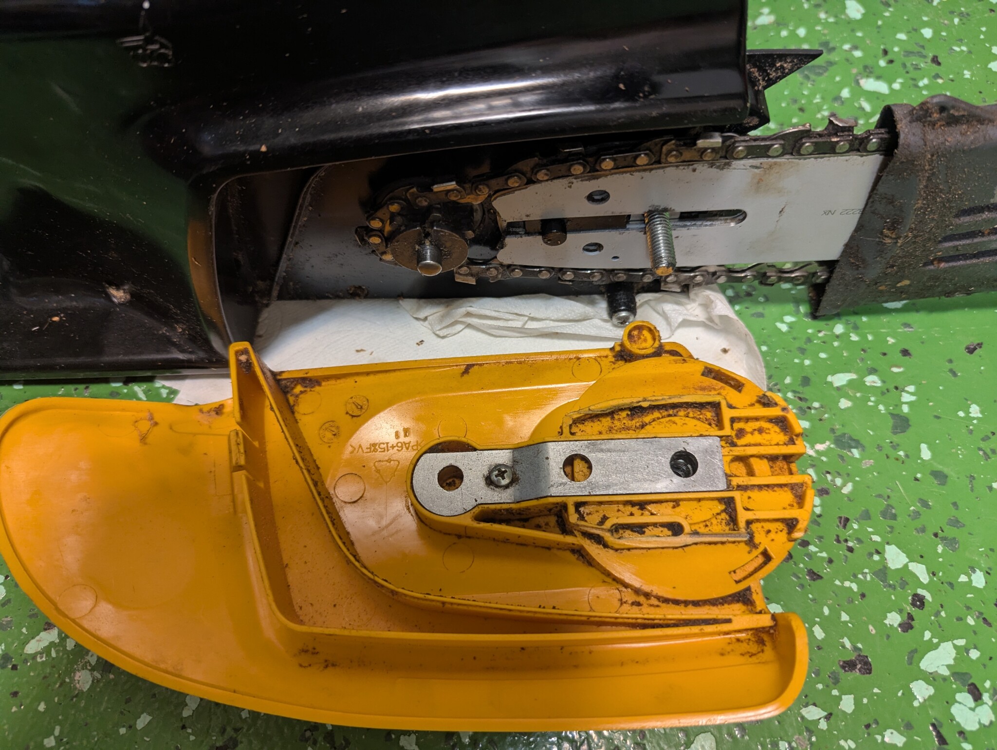 Som syns på bilden nedan så är spiralen i kåpan alltså mot fronten av sågen, inte där den andra piggen sticker ut.