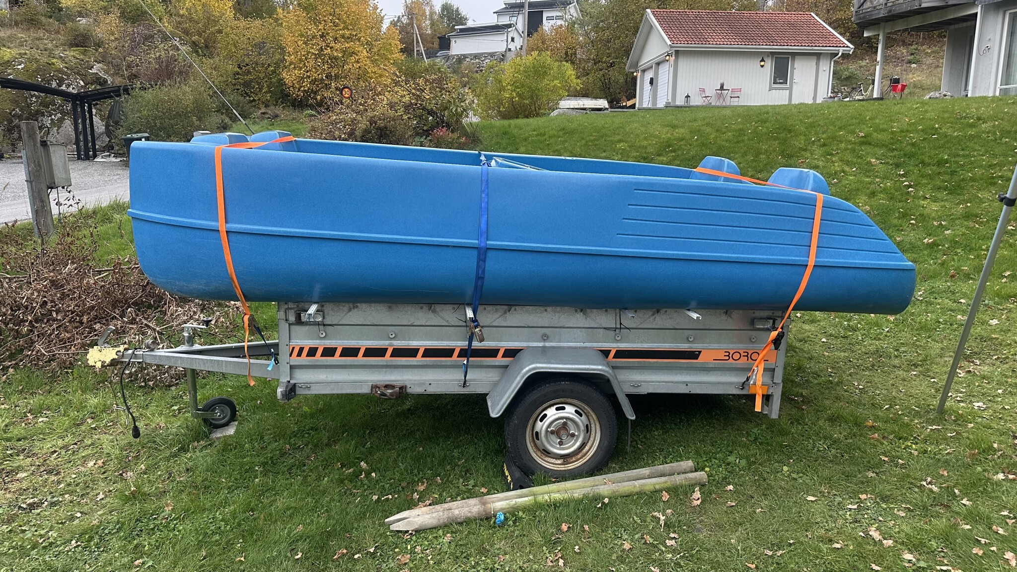 Vi vill inte helt ge upp möjligheterna att färdas på vattnet så jag började söka efter något nytt. Det blev en trampbåt, Pioner Trio, av den större sorten 3,75m lång och nästan 2m bred med en vikt på 175kg. Verkar vara ett gediget norskt bygge.