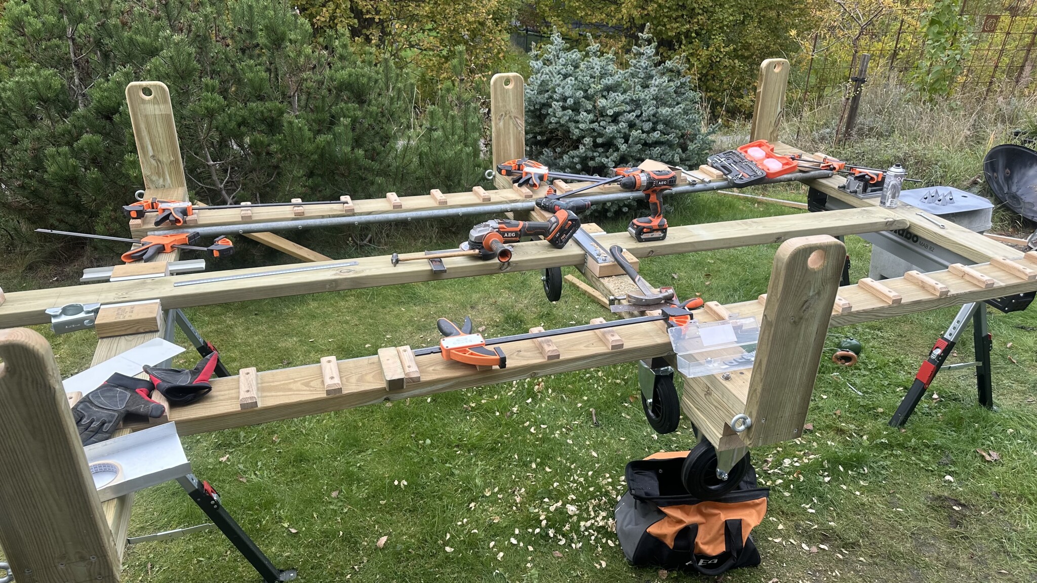 Istället för 20mm rör är dessa 42,4mm med 2mm gods. Färdiga 90˚ böjar med fals för att få jämna skarvar och kraftigare fästplattor.