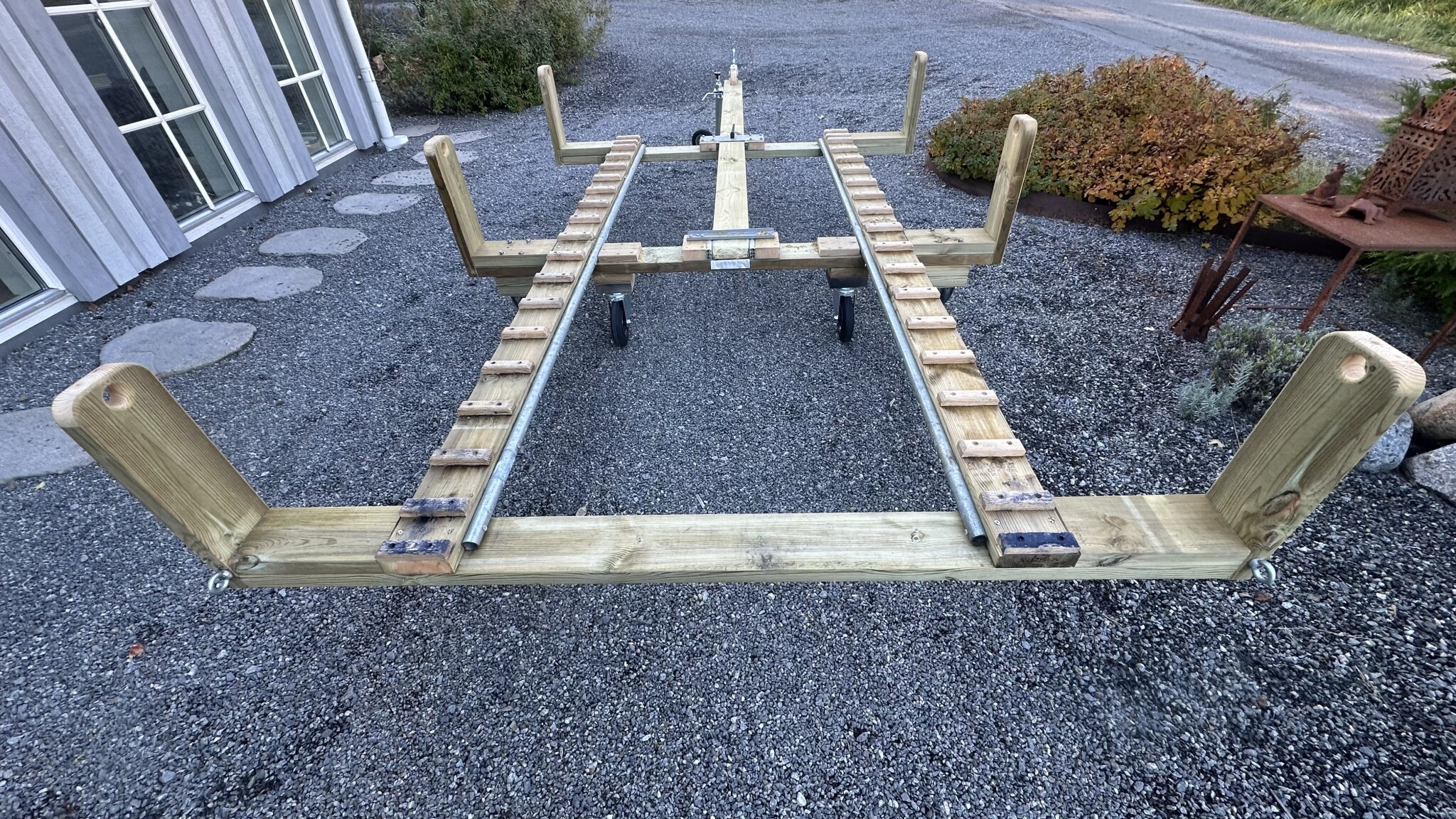 Men där kan den inte stå hela vintern så jag började kolla på någon form av vagn till den. Vagnar för trampbåtar tycks vara obefintlig. Kom fram till två vägar att gå.