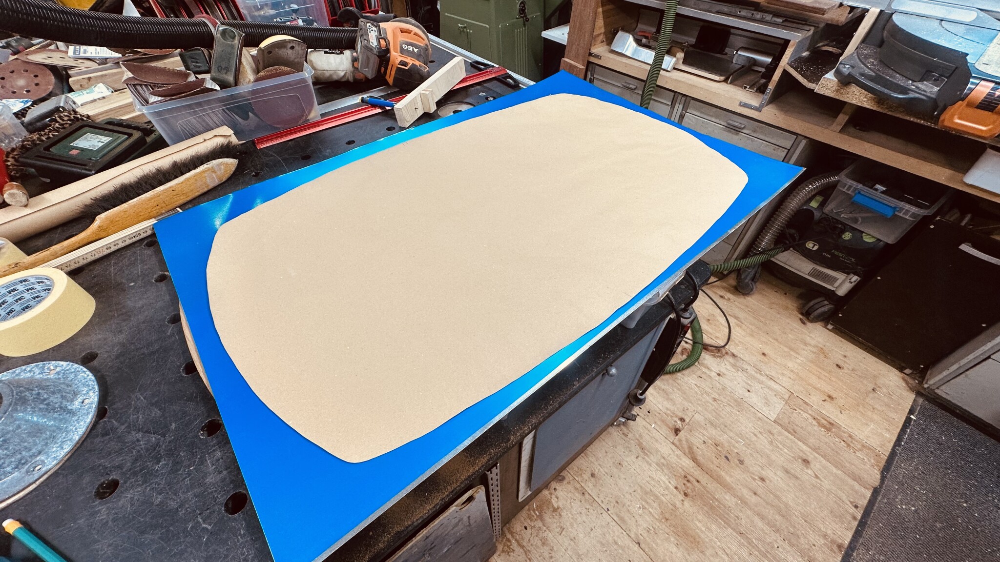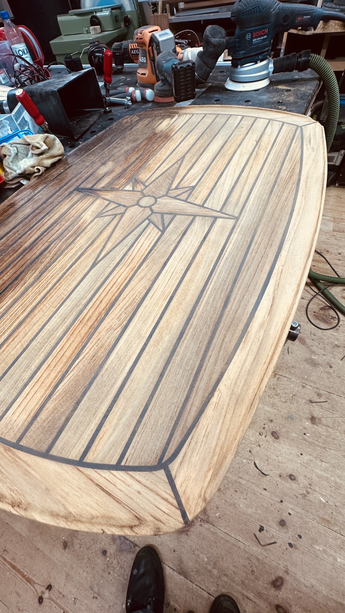 Teakbordet som var ”överoljat” är nu mellanslipat och behöver få en ny bättre täckning undertill istället för den trasiga tunna melaminplasten som hade börjat falla i bitar.