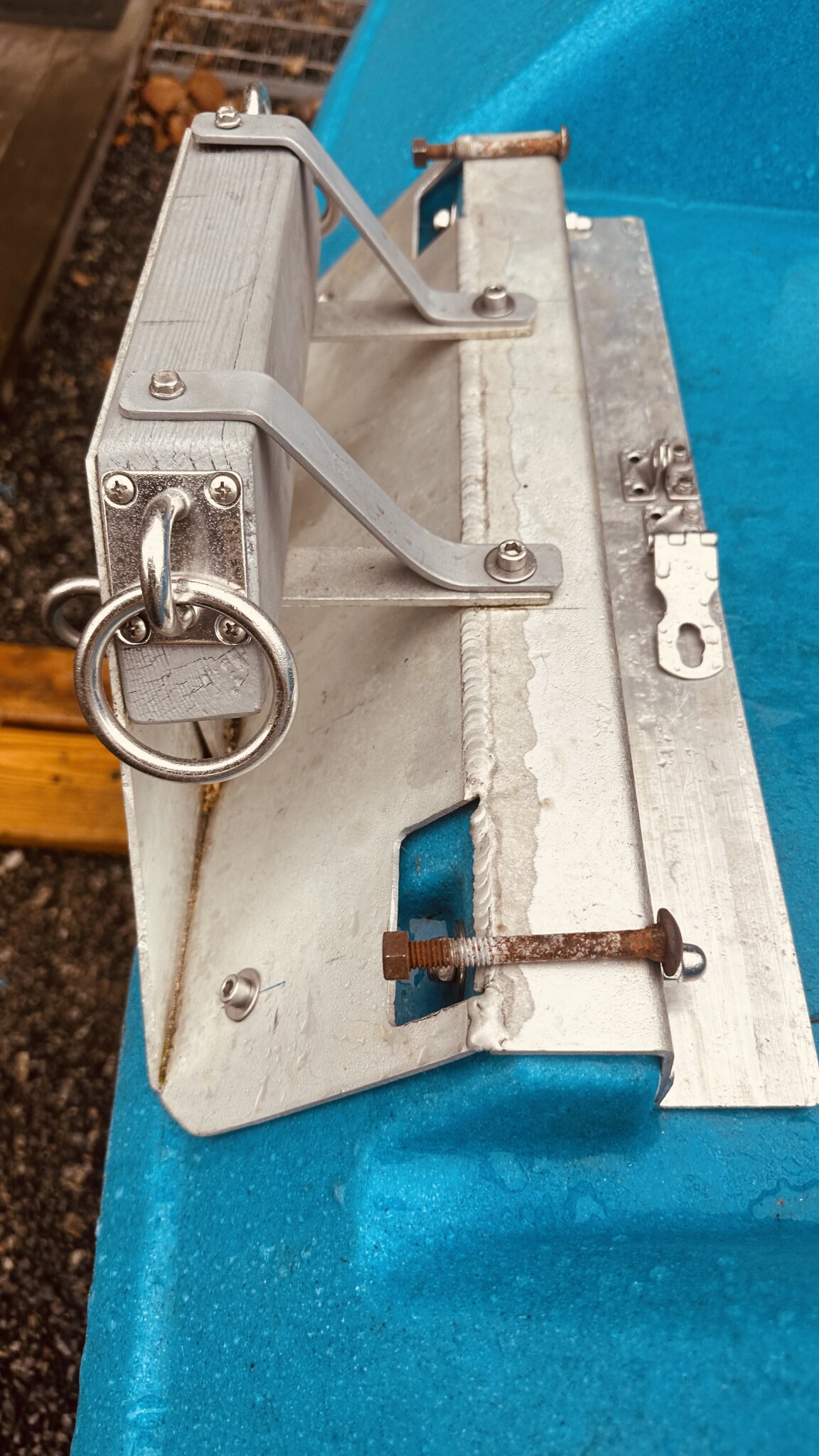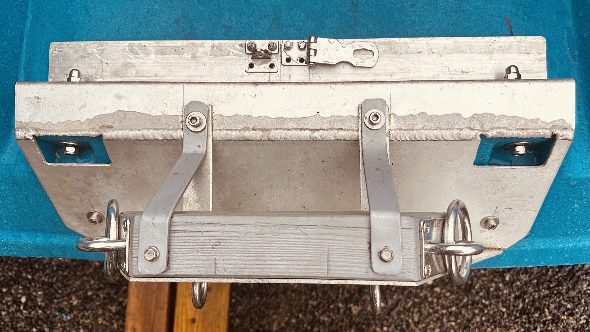 Svikten i fästet berodde till stor del av att plåtens veckade form inte var sluten så två nya stag i aluminium böjdes till rätt form. 4 nya fästpunkter med rostfria M6 rampamuffar i skrovet och två måttanpassade gängstänger M8 gjorde motorfästet helt stumt. Två nya stora fästöglor monterades på motorfästet för att slippa göra fler hål i skrovet.