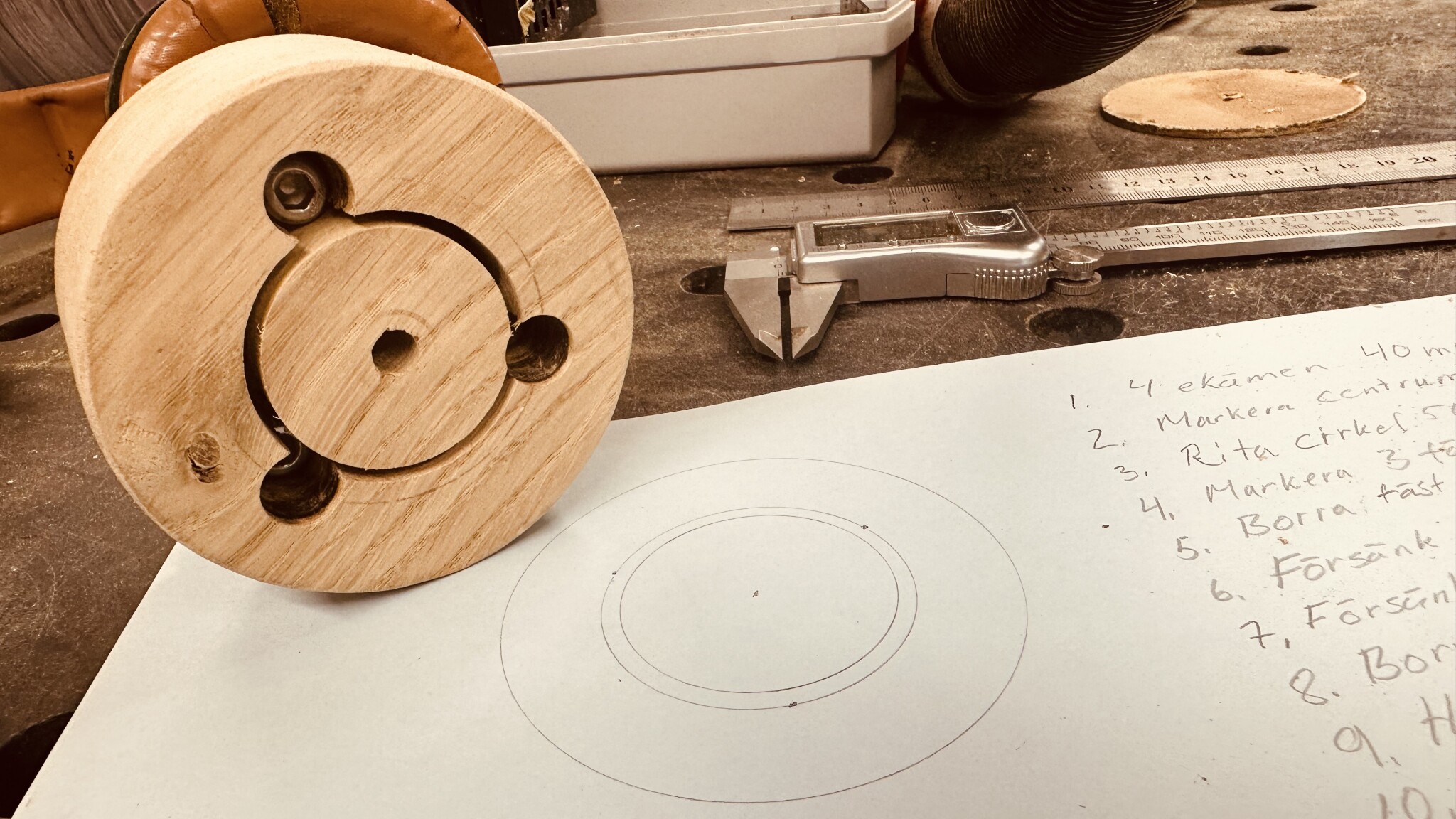 En tjock 2” ekbit hyvlades ner till 40mm för att bli till ämne för dom nya adaptrarna. Jag ritade in 6 stycken för det är ju bra att ha några extra under resans gång.
