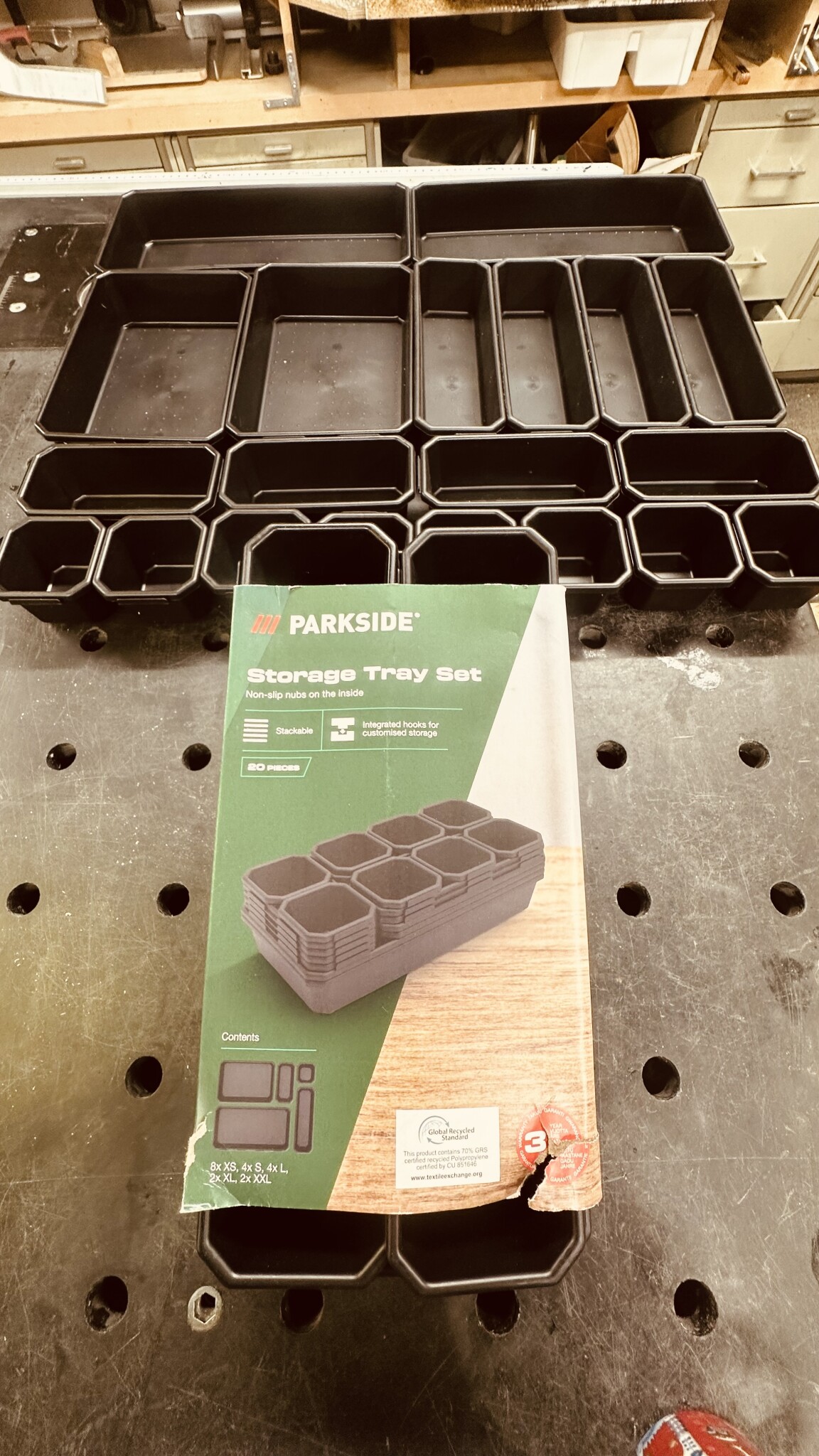 20 stycken modulaskar i olika storlekar för 100kr. Klart intressant! Köpte ett paket och åkte hem och provade i olika lådor. Upptäckte att med dom olika storlekarna gick det väldigt bra att få en bra ordning.