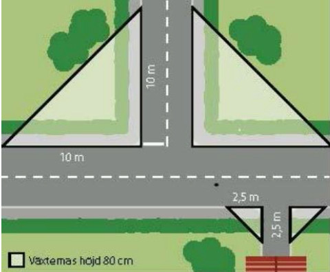 Vid utfart bör du se till att dina växter inte är högre än 80 cm från gatan inom markerad sikttriangel. Sikten skall vara fri minst 2,5 m från gatan eller gångbanan.".