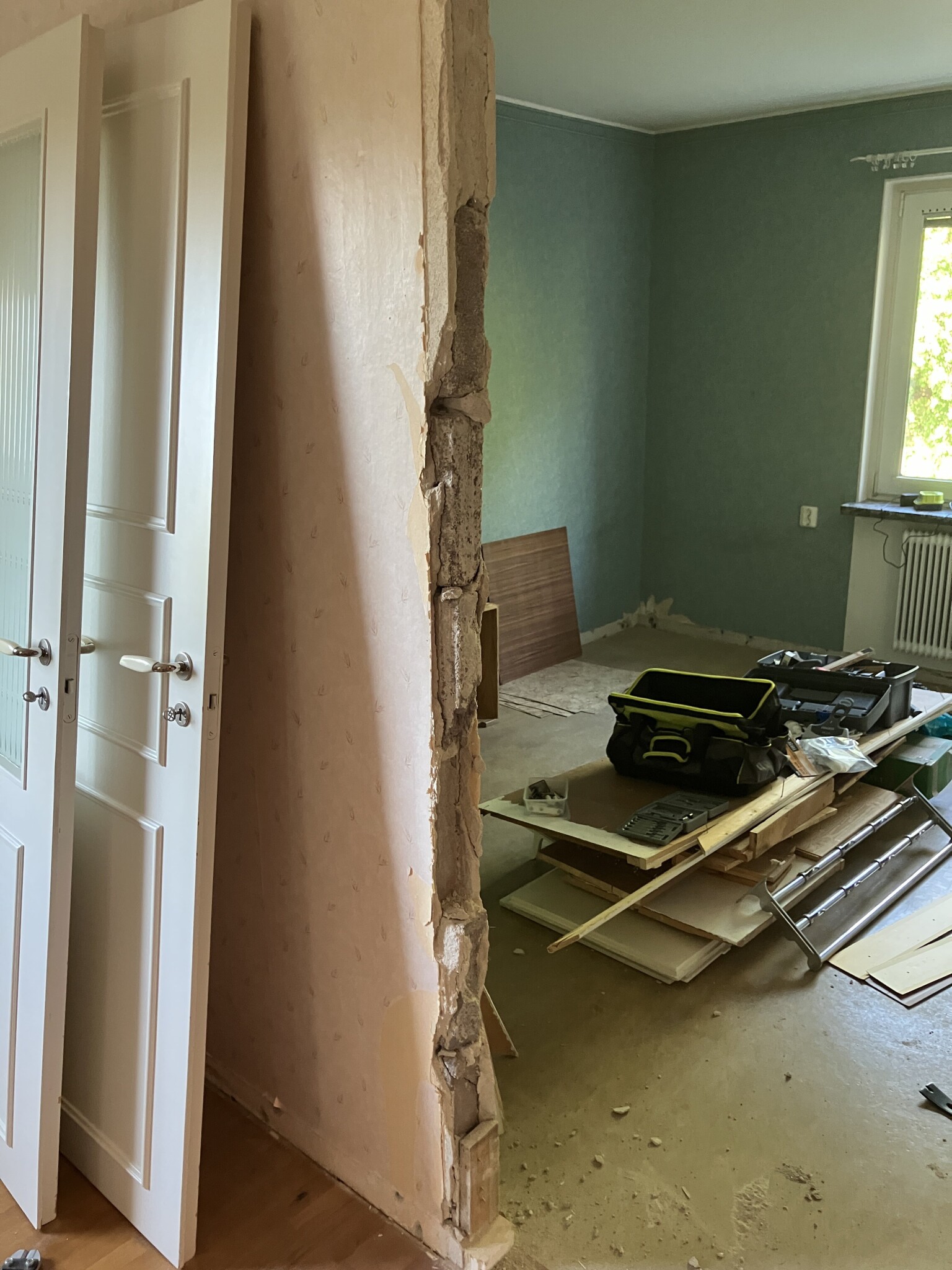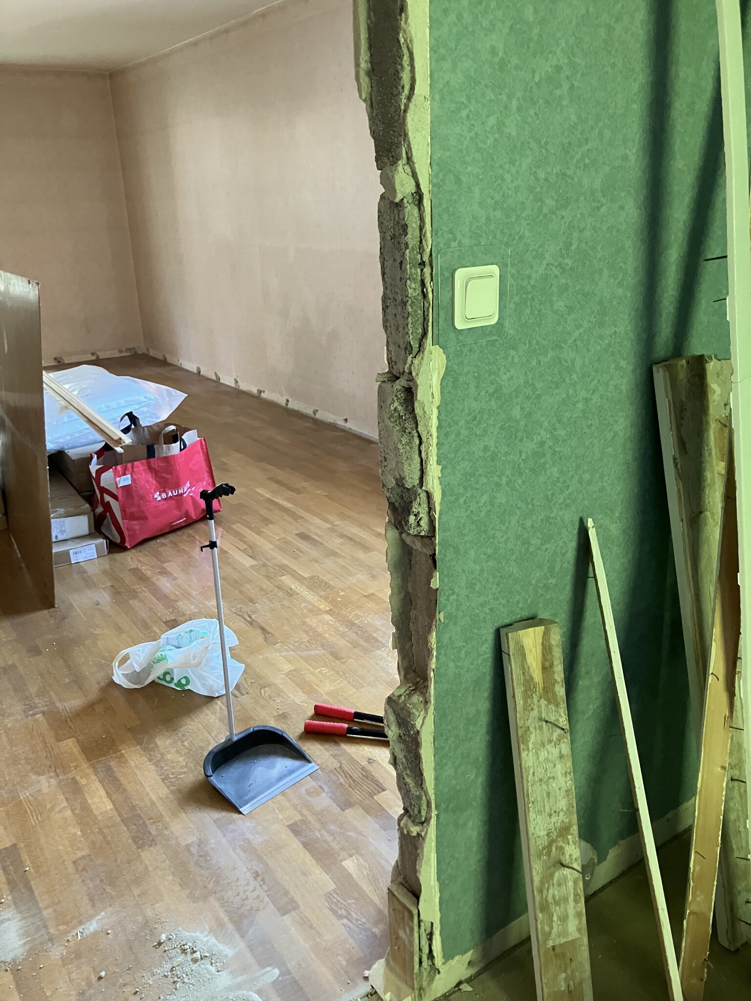 Intro: köpte ett renoveringsobjekt från 50-talet (bodtadsrätt) som verkade schysst nog att forma efter eget tycke och enligt papperna senast renoverad -91. Fick tillträde glad i hågen med verktygslåda i hand och konstaterade att det man faktiskt gjort var att tapetsera lager nummer tre av tapet direkt ovanpå betongputsen och ett våtrumsmattebeklätt yttepytte badrum som vi inte ens ska prata om. I övriga lägenheten ska jag river ut allt utom golven och ska renoveringsgipsa. Sen började mardrömmen: porös lättbetong och överanvändning av betongspik i allt listverk.