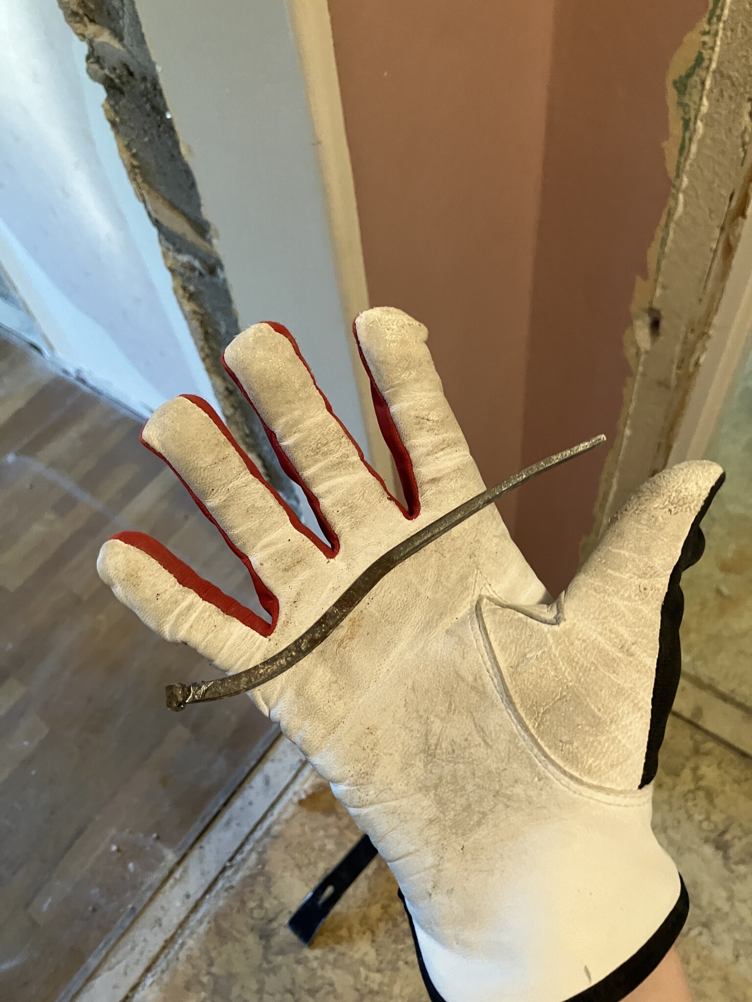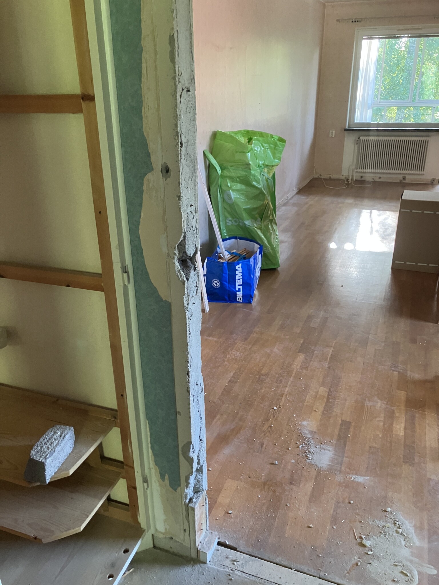 Skulle igår ta ut gammal dörrpost som senare ska ersätta med ny, och visade sig att byggare från från ca -53 murat in spikarna (ca 15cm betongspik, se bild nr 4) och sen fäst träet ovanpå. Samtliga väggar i lägenheten är porös lättbetong så spikarna som följde med plankorna rev med sig mer eller mindre halva väggen.