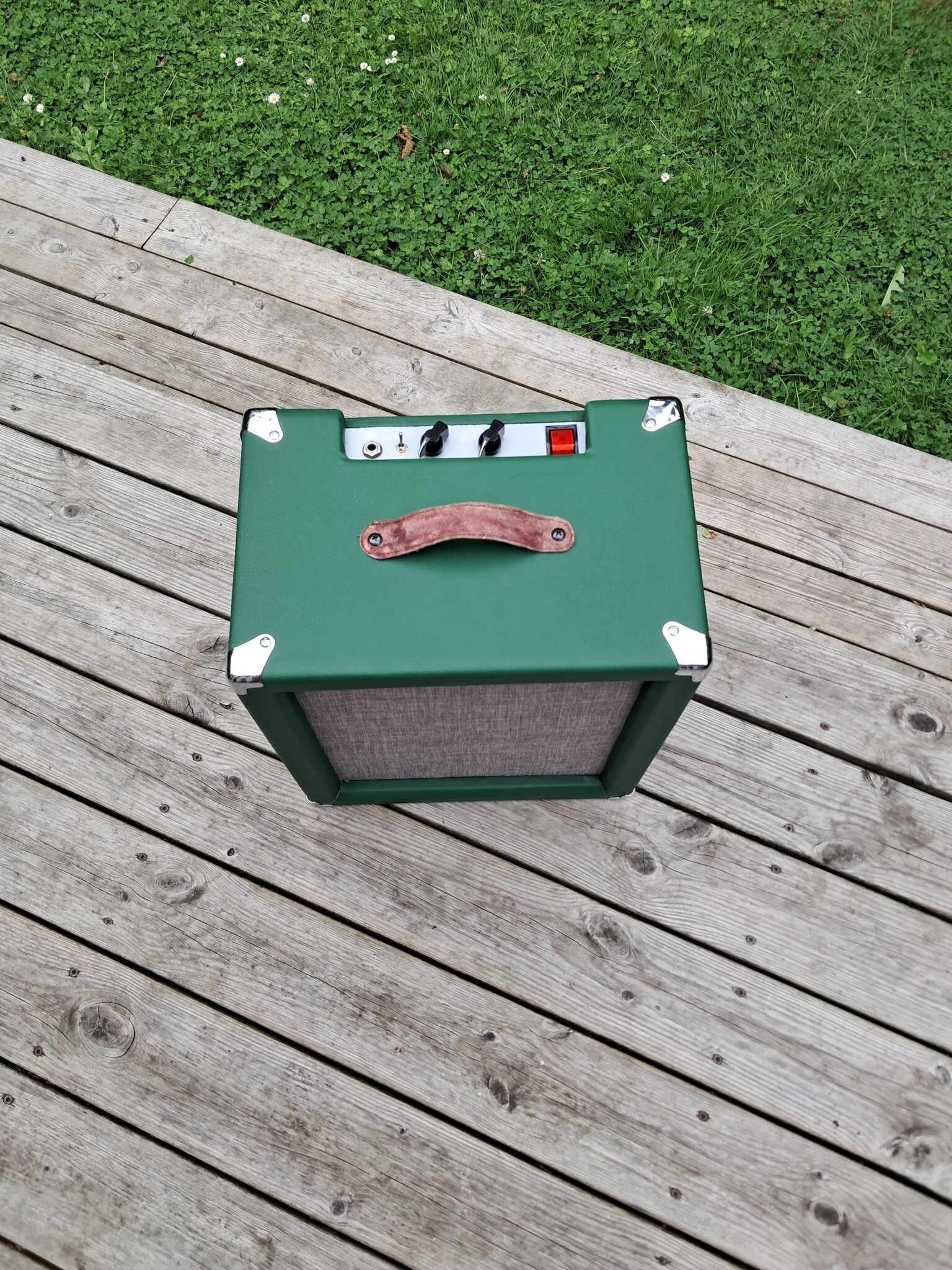 Mitt lilla rörförstärprojekt har efter många år nu äntligen blivit slutfört. Det blev en 10" öppen combo med grön tolex. Handtaget är älgskinn förstärkt med en stålremsa inuti. Utöver gersåg och borrmaskin så byggde jag med handverktyg för "mysfaktorns" skull.