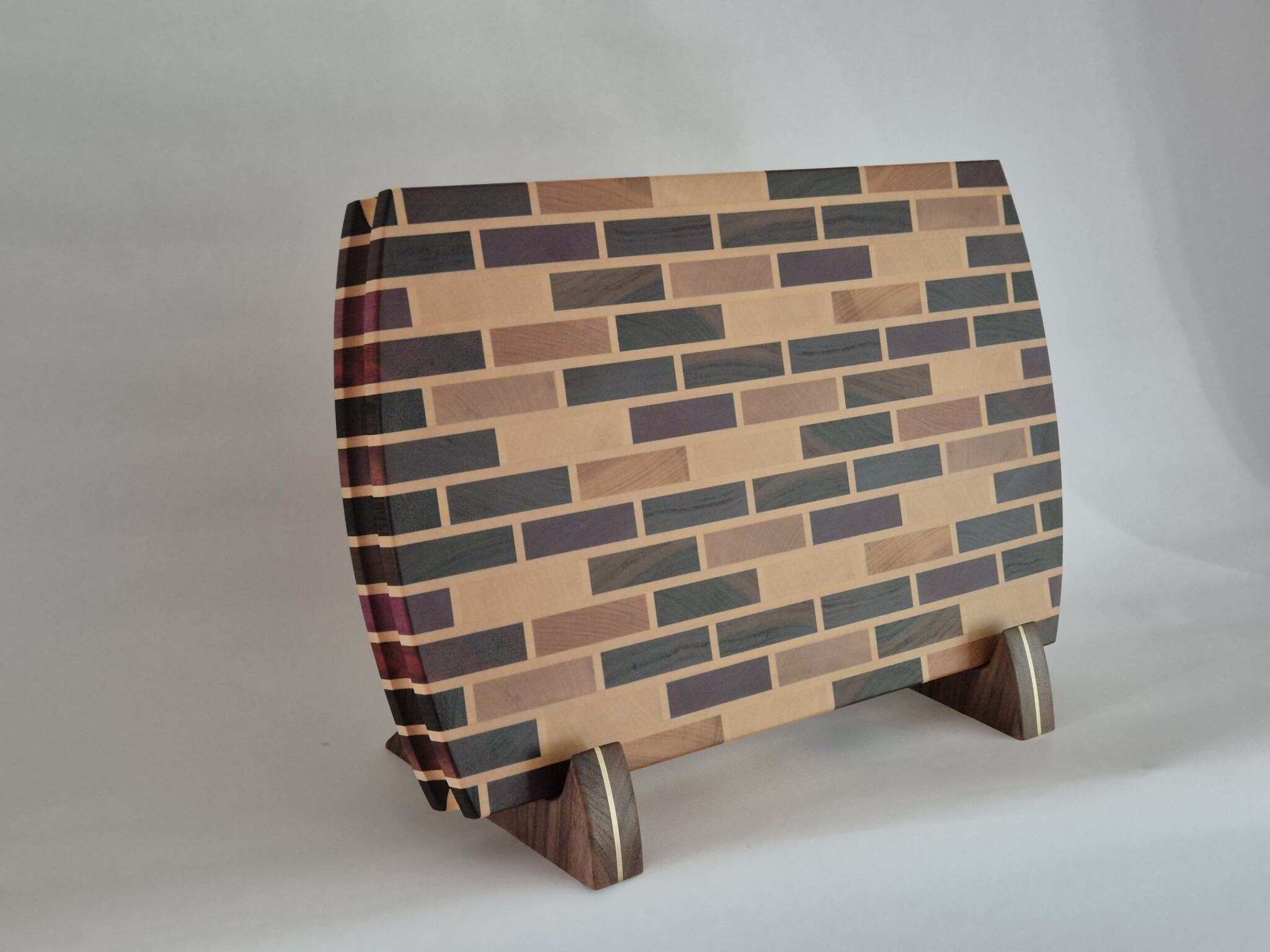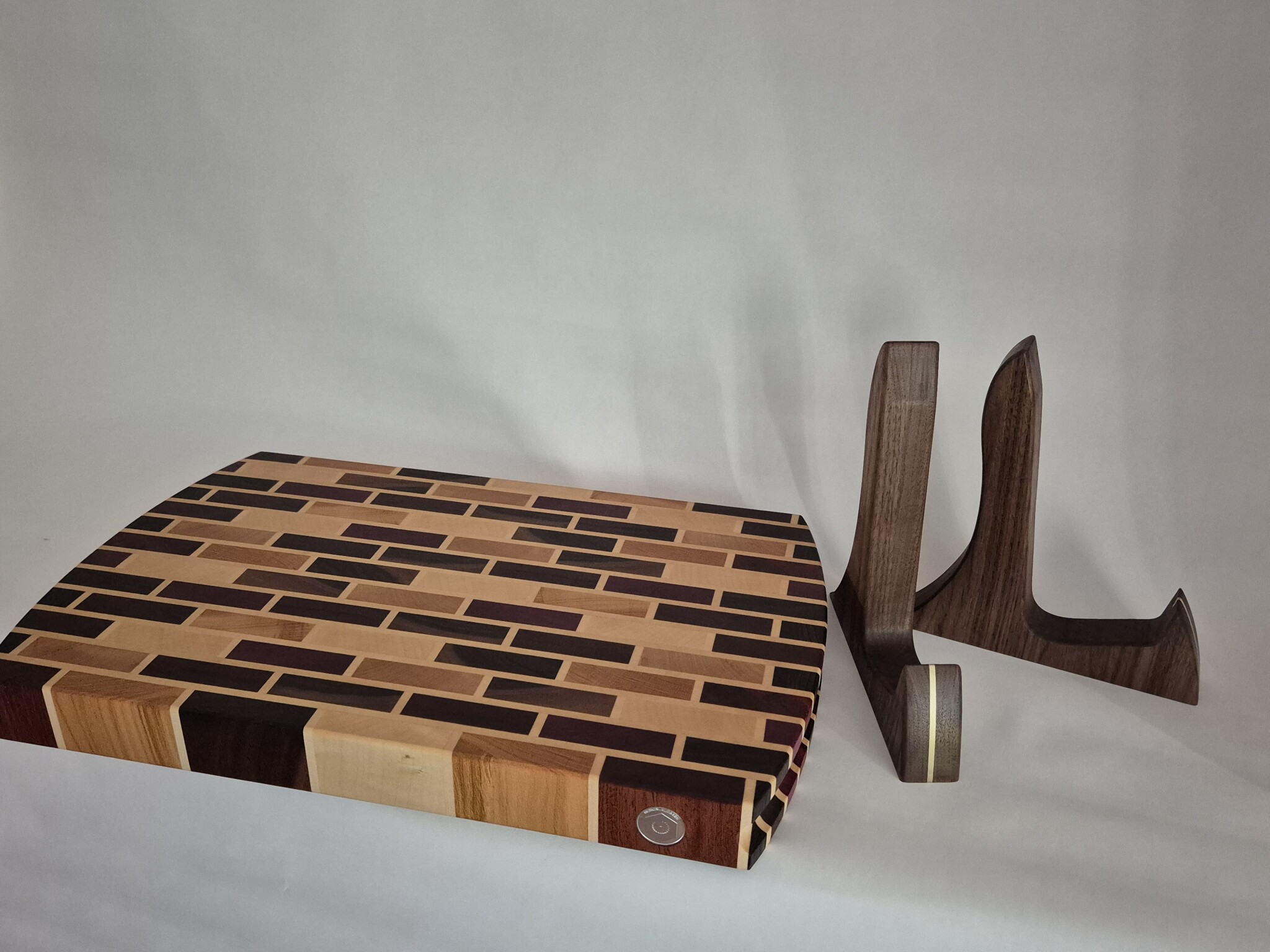 Lite diverse exotiska träslag som blivit liggandes samt tillhörande ställ/fötter i valnöt med en bit infälld mässing.