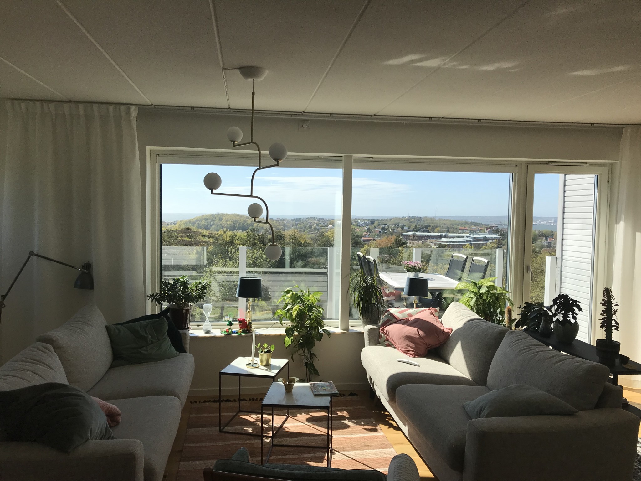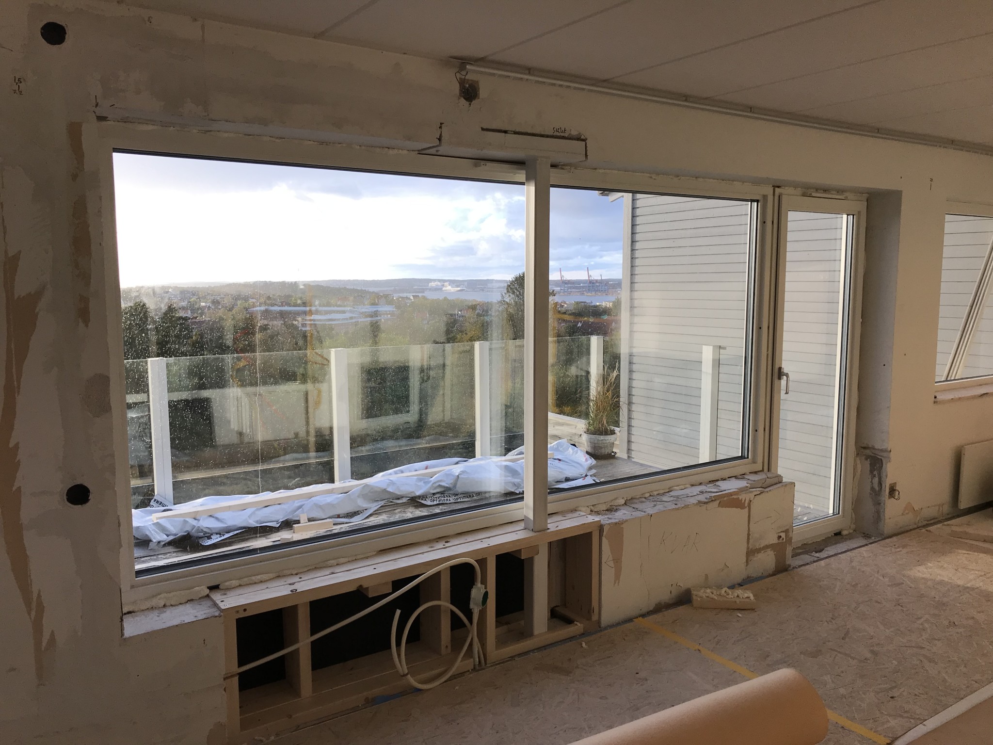 Tänkte knyta ihop säcken på mitt eget topic med en såhär blev det bild. Efter många turer gjorde vi i höstas slag i saken och öppnade upp för större fönster och altandörrsflytt. Vi fick priser på att helt avväxla öppningen med balkar runt om öppningen och golvbjälklaget. Det var dock alldeles för dyrt så lösningen blev en stålstolpe som fick gå ner i mitten, innanför, fönstret. Denna stolpe tar all vikt från de två lättbetongbalkarna som bar upp den gamla öppningen. En kompromiss som vi inte har några som helst problem att leva med - faktiskt nästan tvärt om. Stolpen hindrar en akvariekänsla som annars skulle kunna infinna sig.