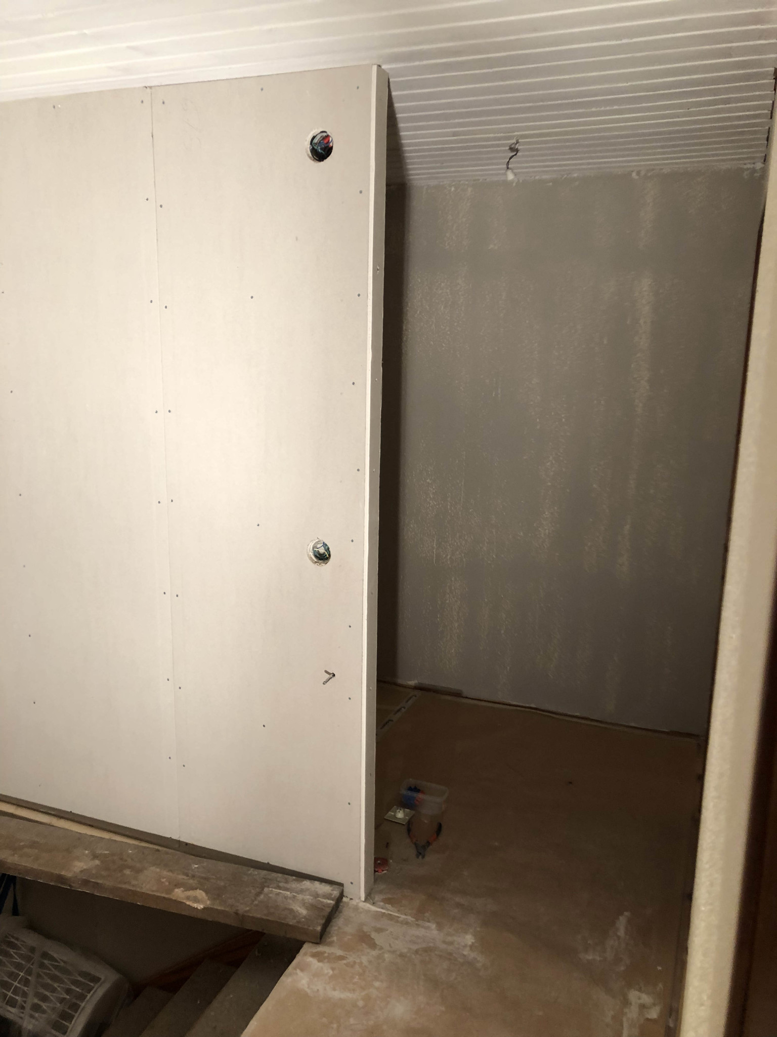 Här har vi 2 st testmetoder igång. På den bakre väggen så har vi testat bredspackla hela väggen. Det gick inte, så det kan ni skippa att pröva. Problemet var att tapeten typ "bubblade" sig när spacklet torkade. På den främre väggen (vid trapphålet) så satte vi en gipsskiva, snabb och smidigt!
