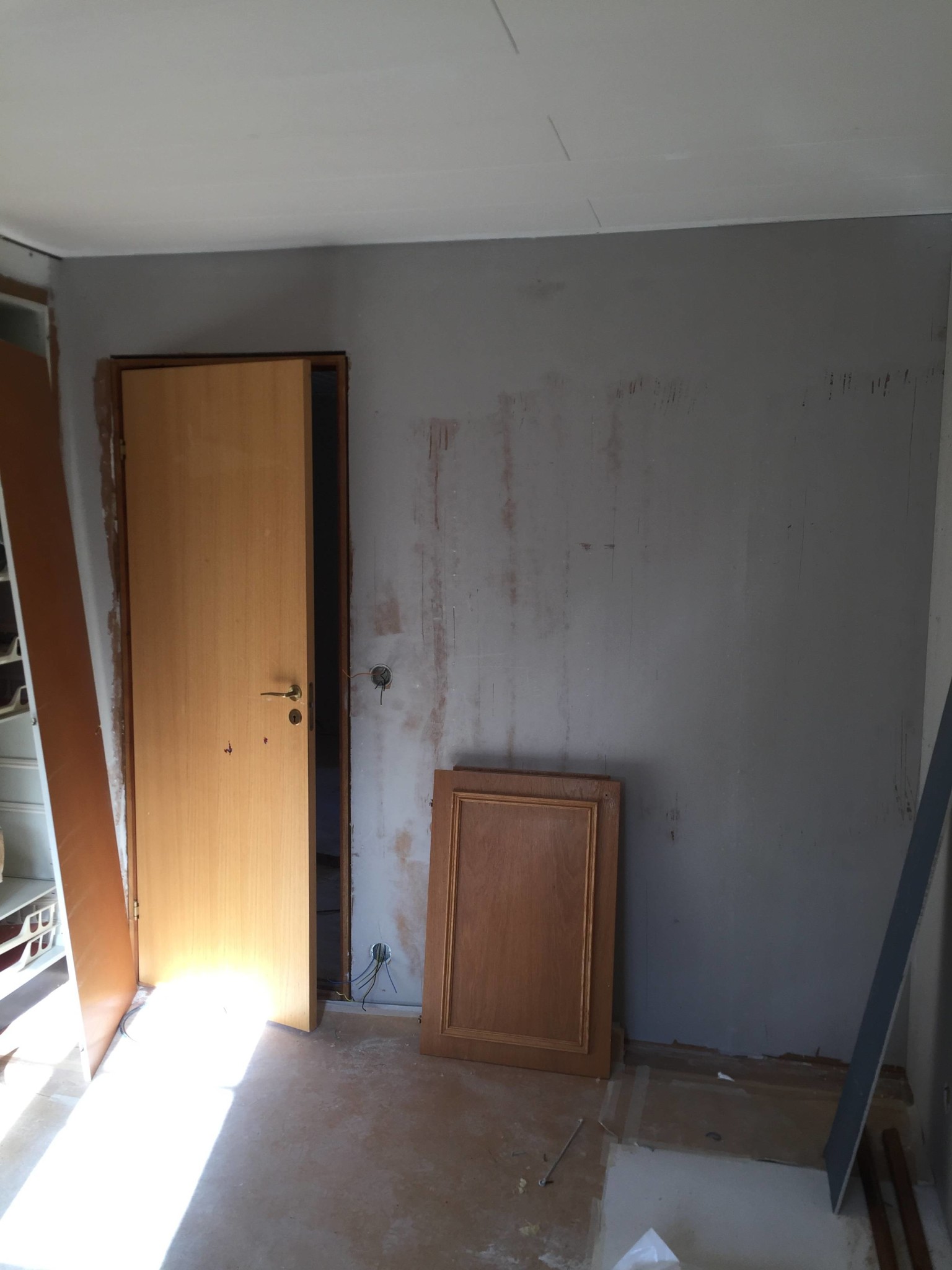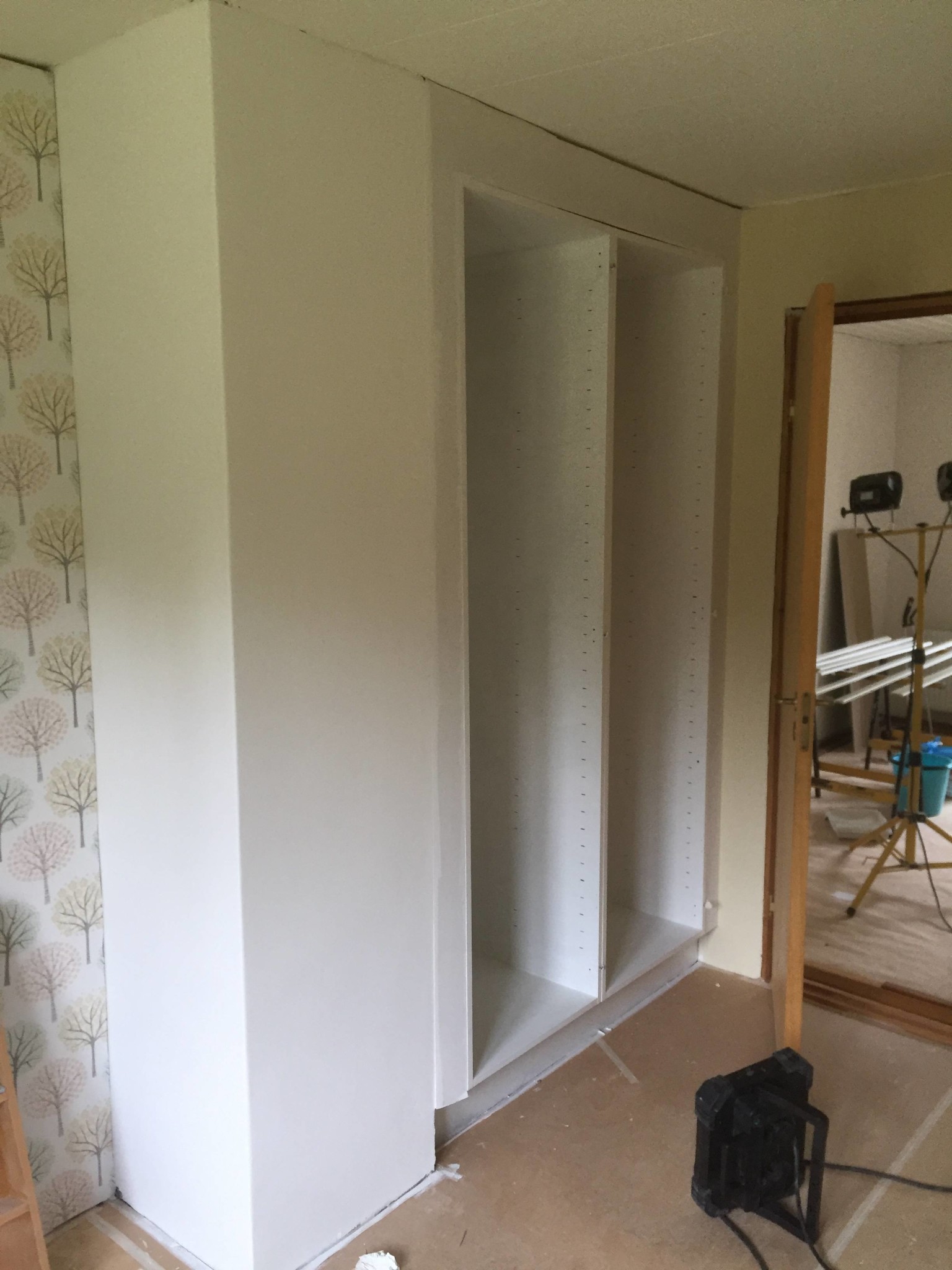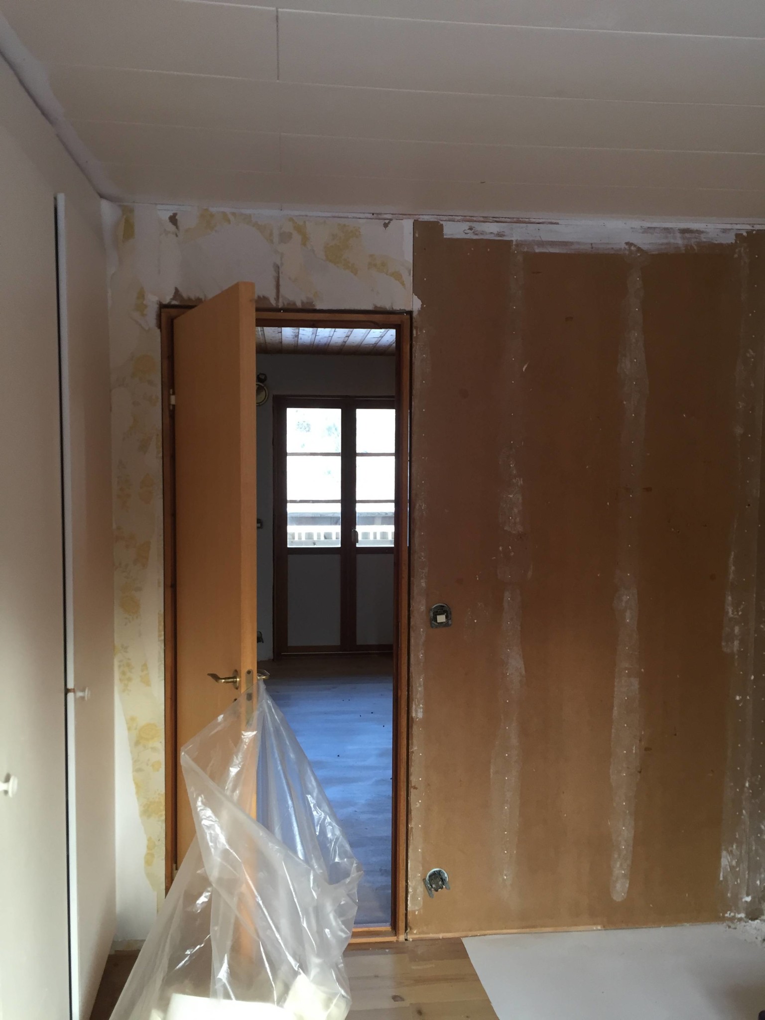 Murstock samt befintliga platsbyggda garderober. Vi valde att renovera och behålla dessa. Slipade och målade, nya knoppar och magneter. Funkar utmärkt.