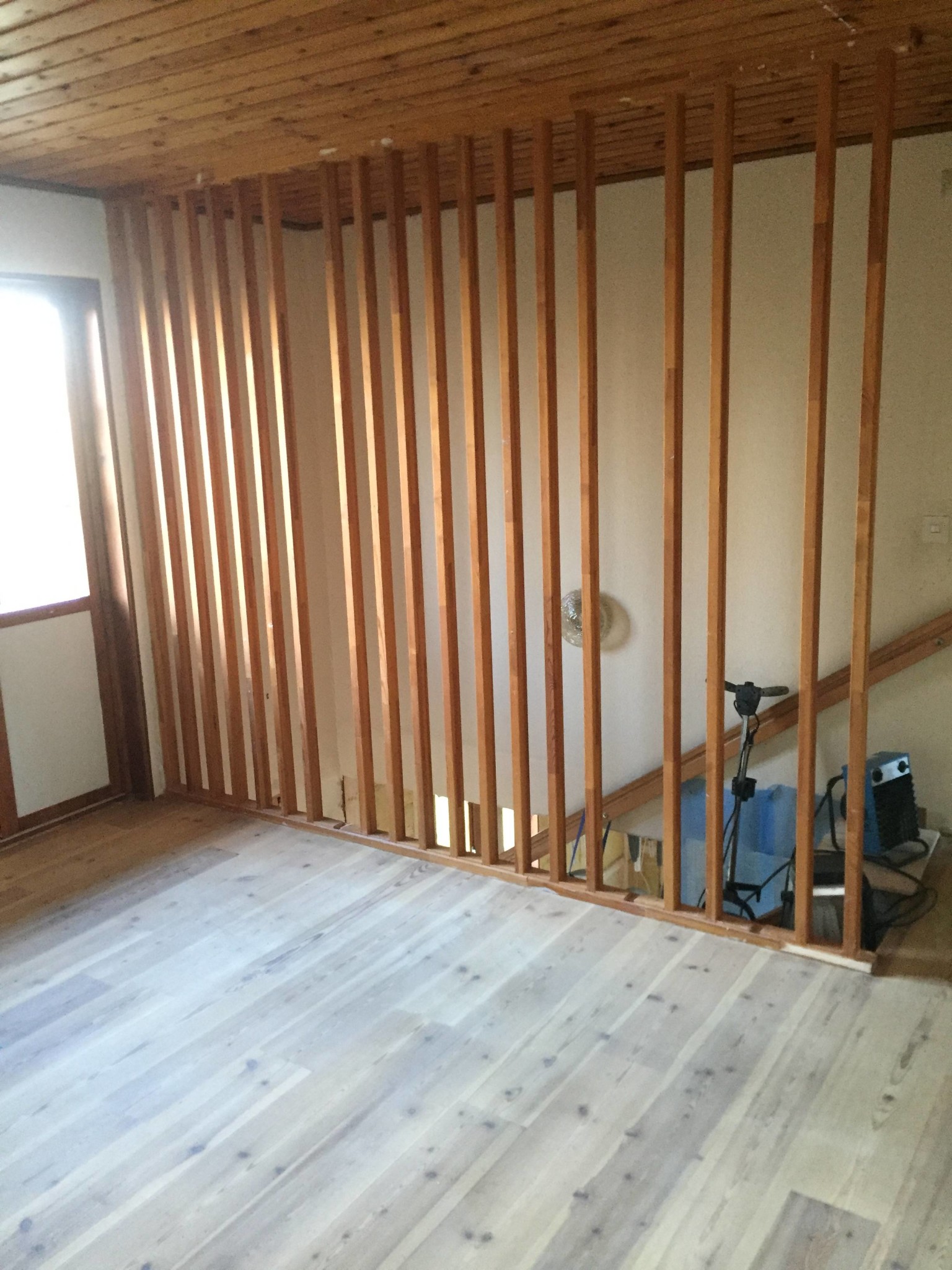 Golvet slipat, men i övrigt orörd övervåning. Denna spaljé rev vi fram när vi rev upp det rum som var på denna plats. Trots att vi rivit upp och fått in ljus på övervåningen gör trätak och helspaljé att det är rätt dunkelt ändå.