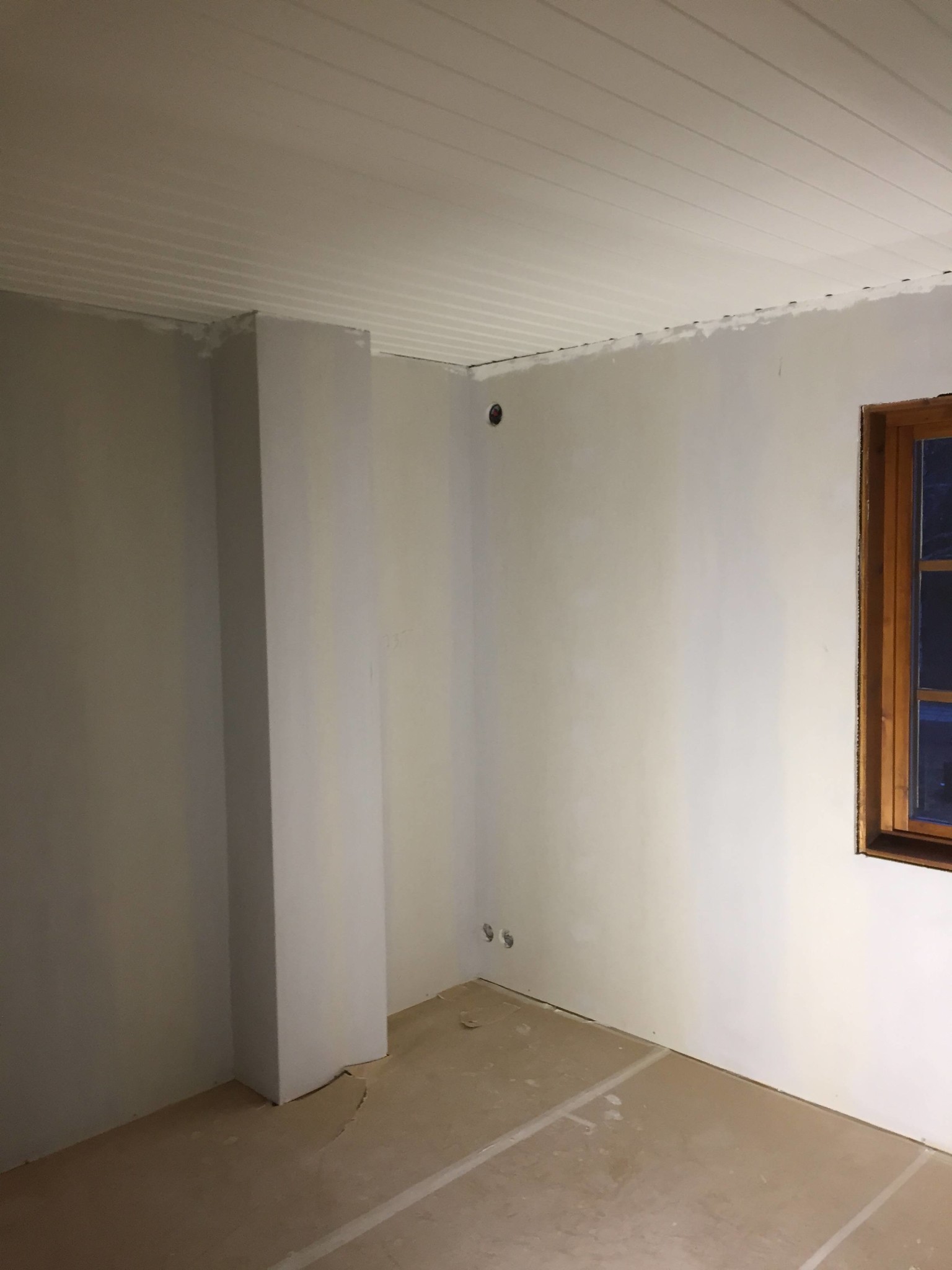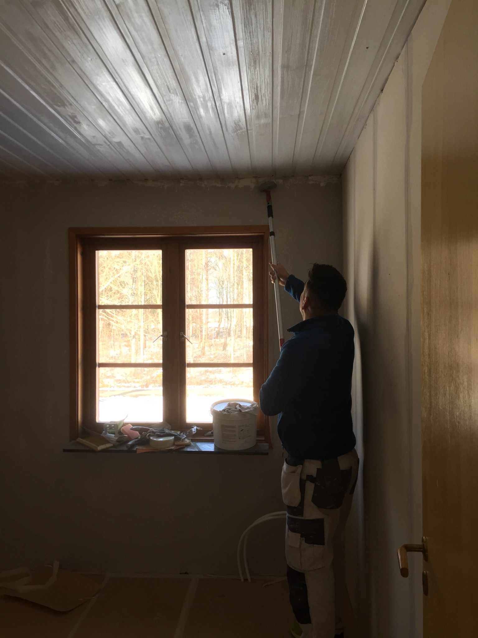 Grundfärg + två lager takfärg och en helt annan känsla i rummet. En ny radiator och en tilluftsventil i vägg.