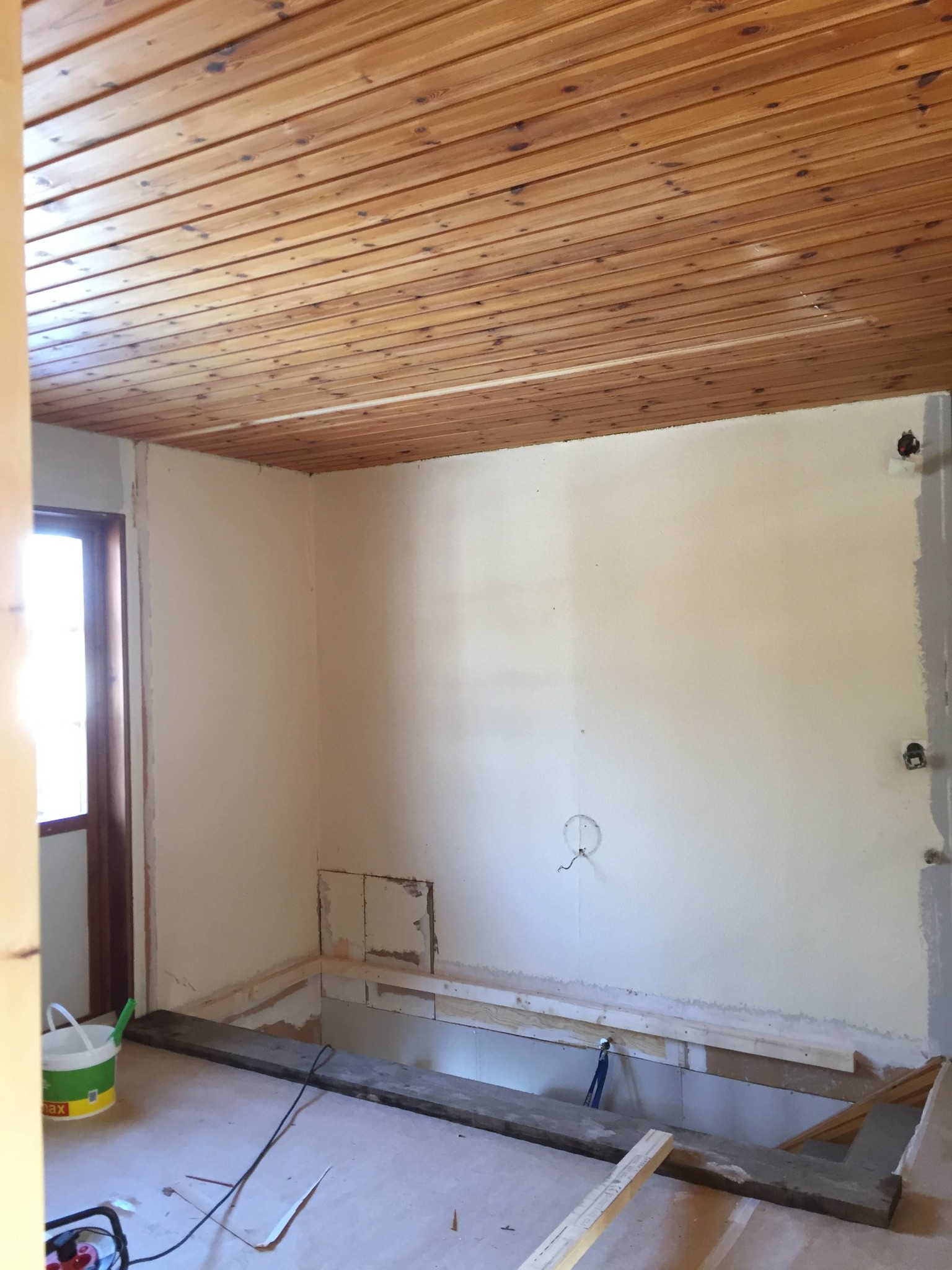 Jag funderade på renoveringsgips, men de är dyrare än vanliga gipsskivor, så vår lösning blev att gipsa på ett lager gips på dessa väggar.