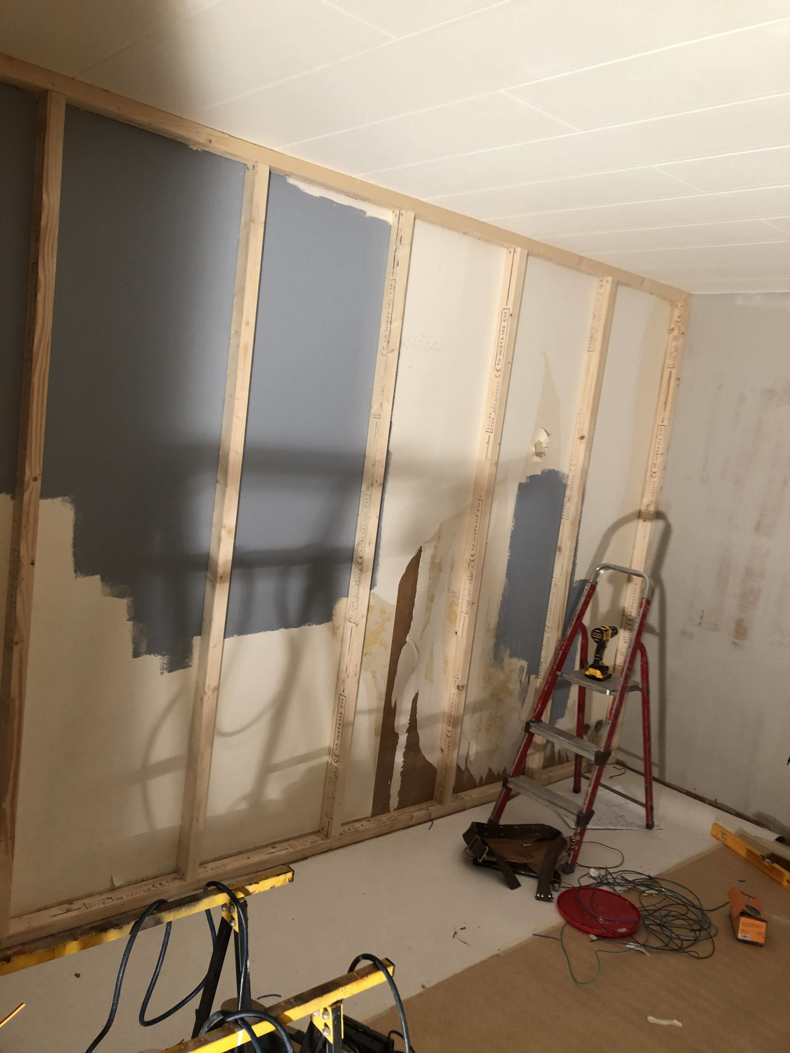 Ena sovrumsväggen uppreglad med 70-reglar framför befintlig vägg.
