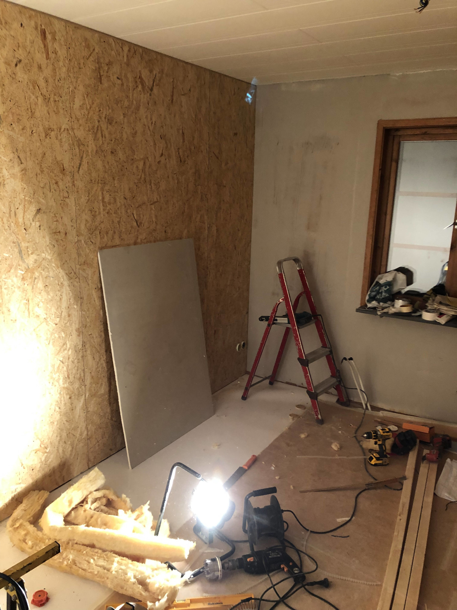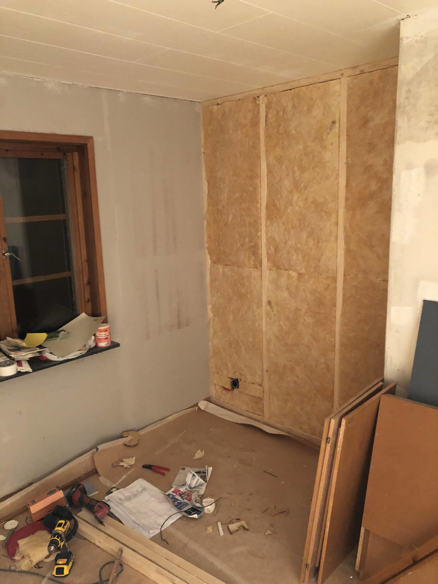 Som jag har pratat om tidigare var innerväggarna i detta hus verkligen minimalistiskt byggda med 45x30-reglar och en masonitskiva på vardera sida, d.v.s. plockepinnväggar med god lyhördhet. Därför blommade tanken upp i mitt huvud att åtgärda detta i samband med renoveringen. Tankarna landade slutligen i att vi byggde på innerväggarna i det mittersta sovrummet.