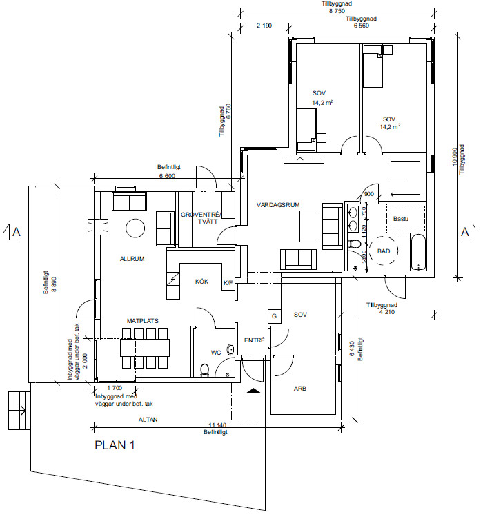 - Vi kommer bo kvar i det befintliga huset under bygget, planlösningen är anpassad efter detta.