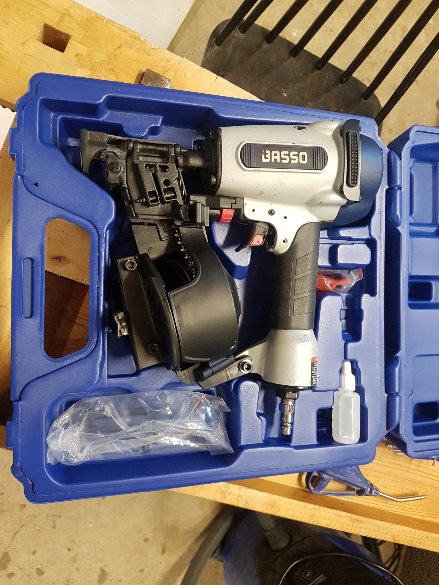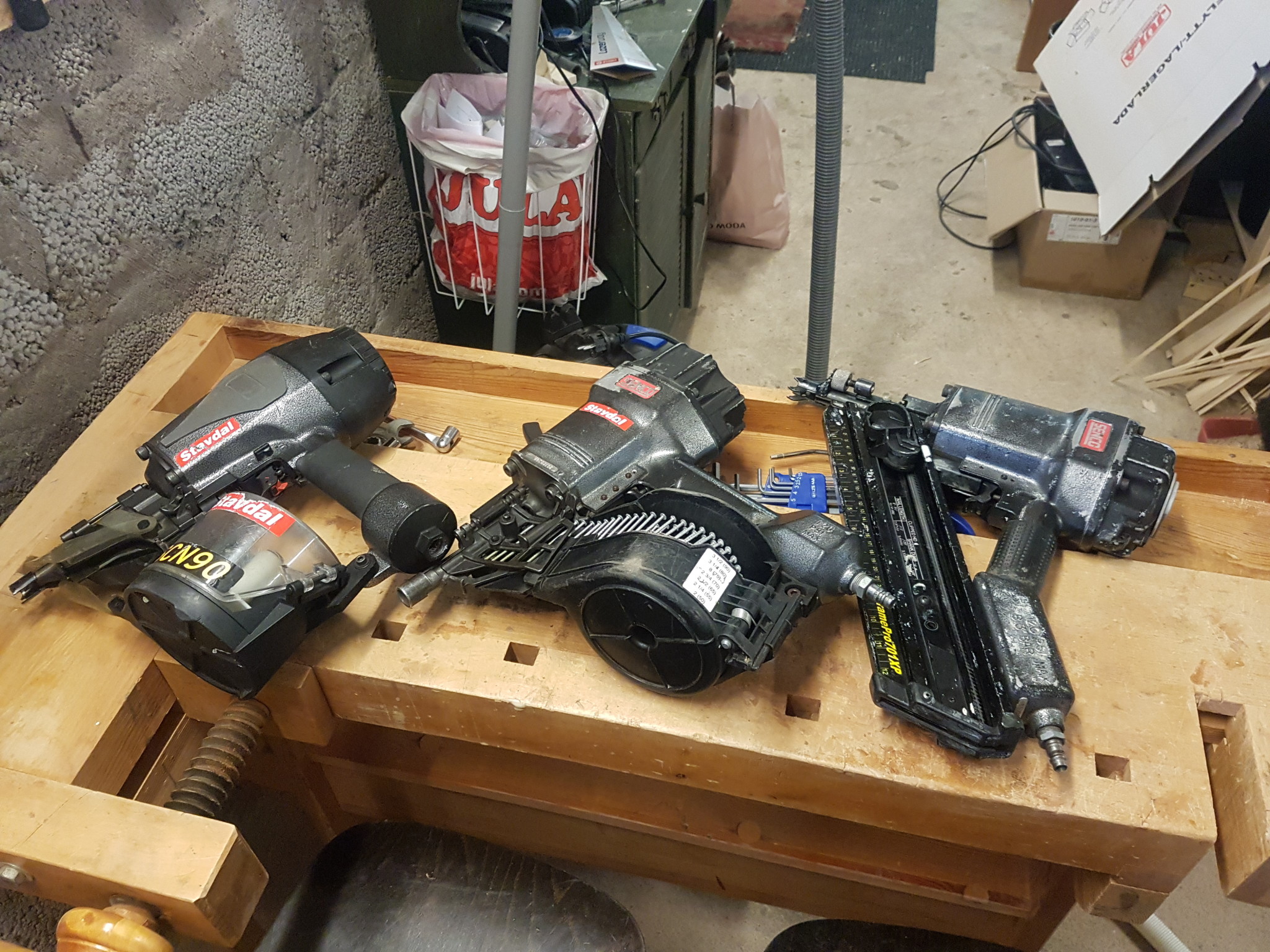 3 spikpistoler på auktion. Har servat dem nu i helgen. Lite skavanker men fungerar nu till synes felfritt. En läcker vid avtryckaren, ska nog köpa en sats med o-ringar och se om det hjälper. Behöver också köpa en bättre kompressor, den befintliga från Jula klarar inte riktigt jobbet