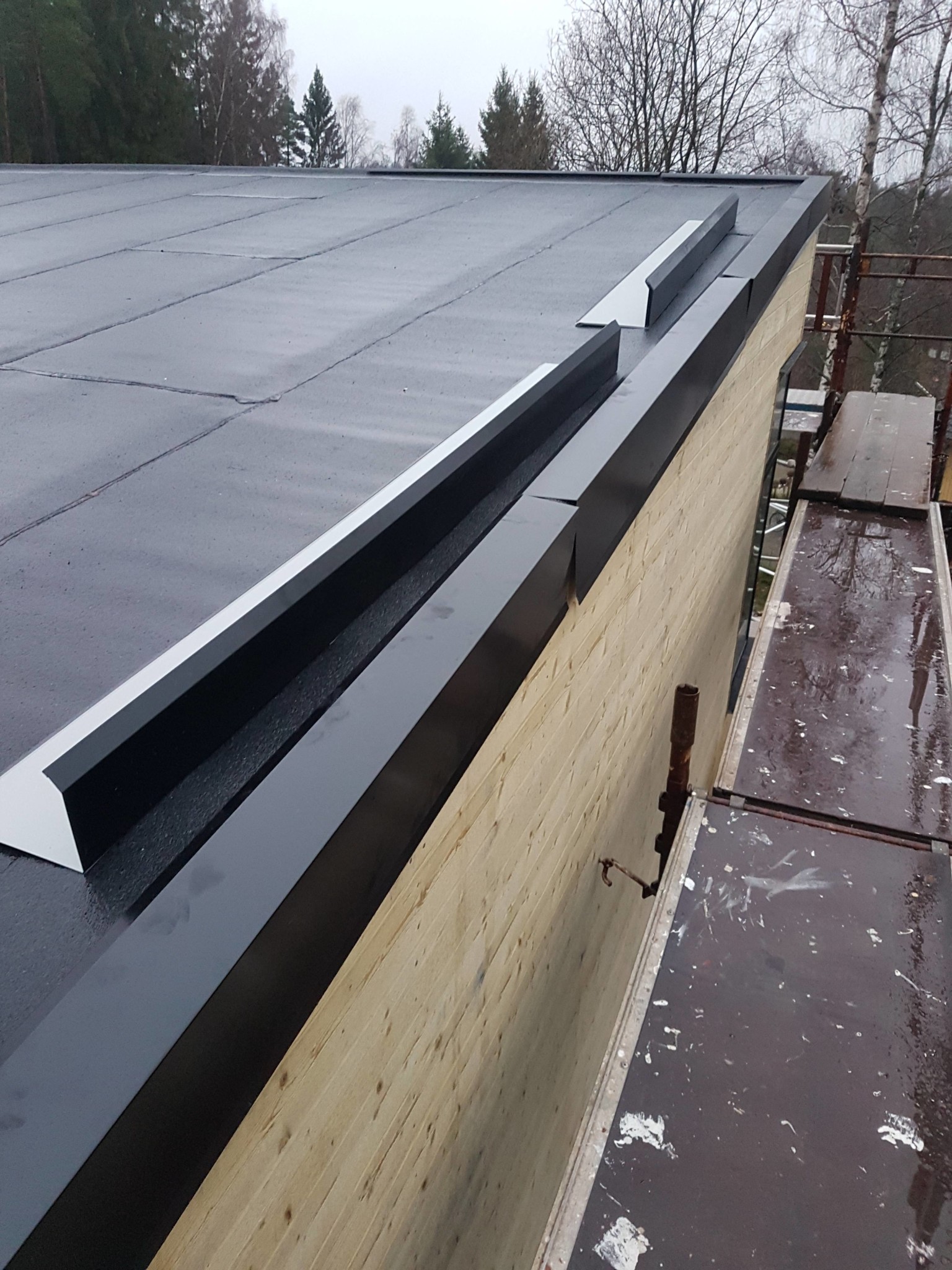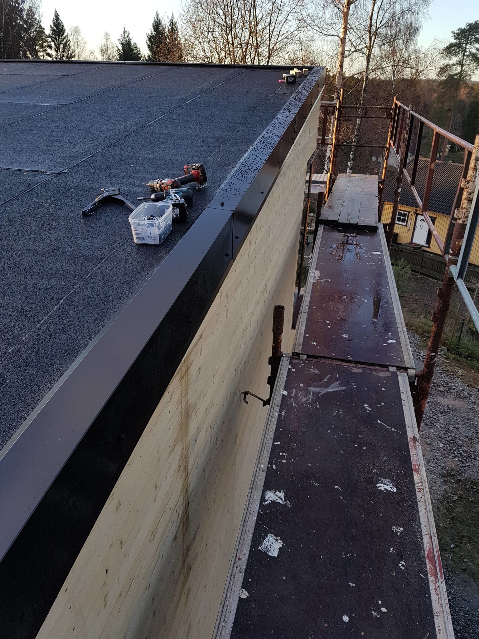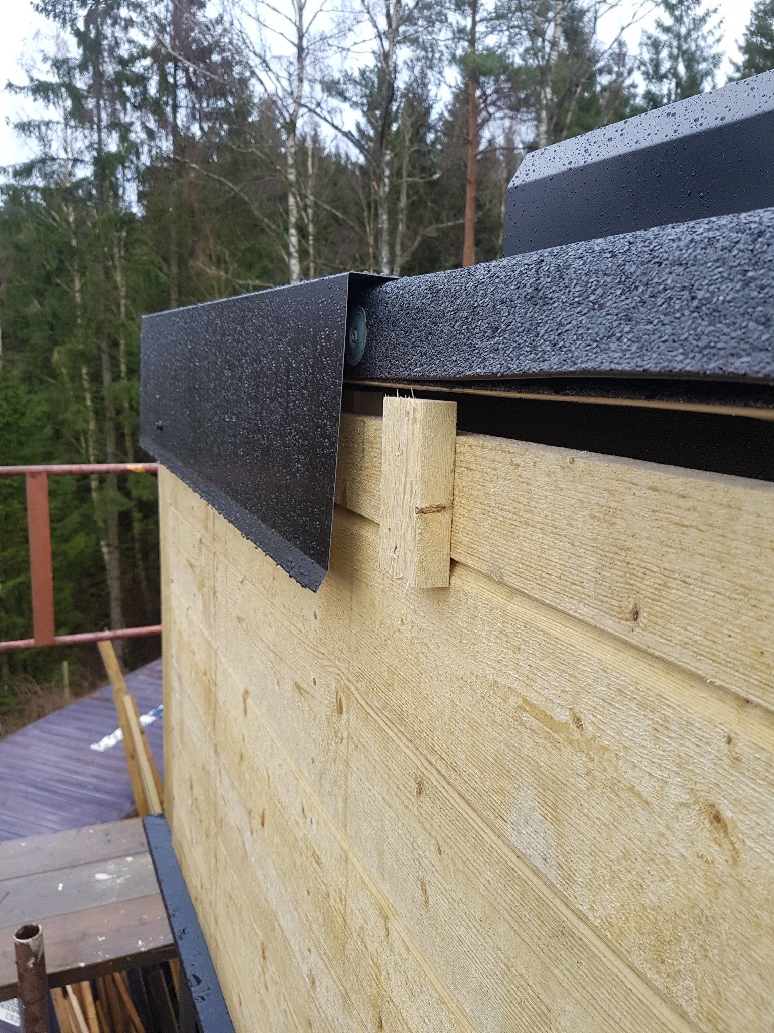 Plåtslagaren bockade plåten och fixade hörnen, så jag kunde montera allt själv. Skruvade dit lite klossar som distanser så att luftningen av tak och väggar blir intakt. Gör också att plåten blir jämn och fin trots att takpappen är lite bubblig.